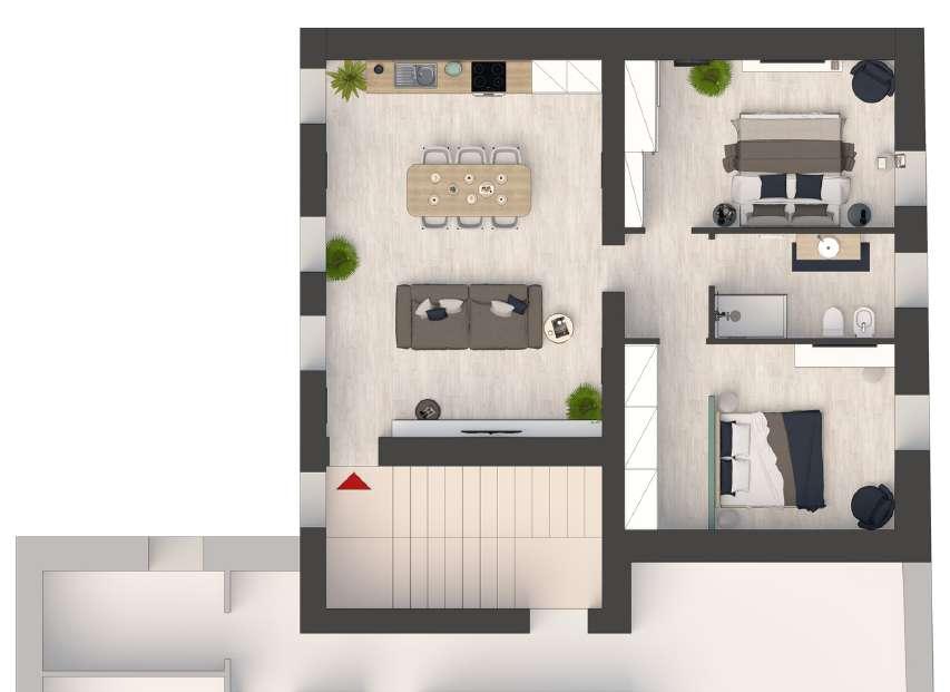 Nella ricerca dell’ottimizzazione degli spazi, il progetto è predisposto per ulteriori adattamenti e ampliamenti. Ad esempio si può ricavare un ulteriore bagno nel sottoscala.