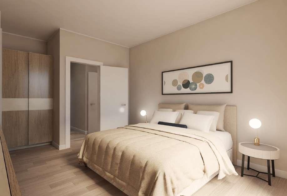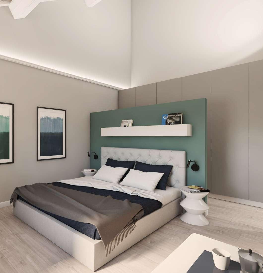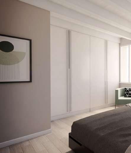 Nella zona notte i colori sono riposanti, così come i materiali, dall’intonaco al legno. In una camera da letto c’è una cabina armadio, ottenuta grazie ad una soluzione architettonica che crea il muro d’appoggio alla testiera del letto.