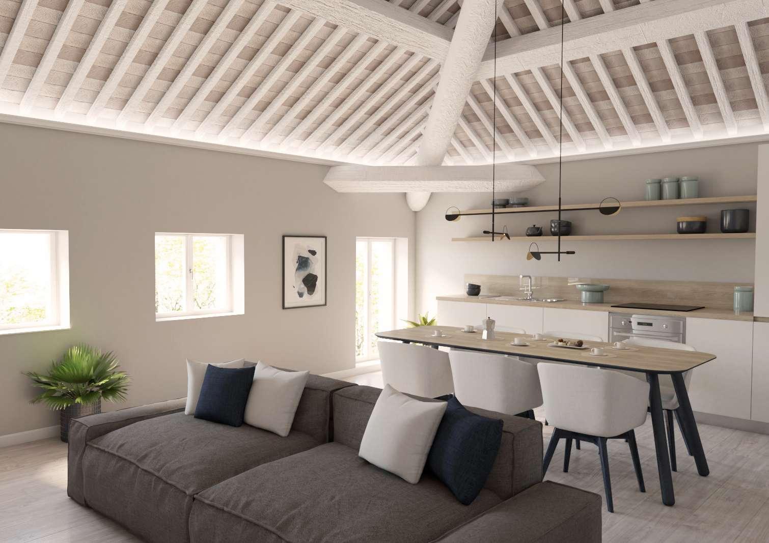 Abbiamo restaurato il tetto dipingendo i travetti di bianco e usando un’illuminazione a led lungo il perimetro, così da slanciare la vista verso il soffitto, punto di forza di questo ambiente.