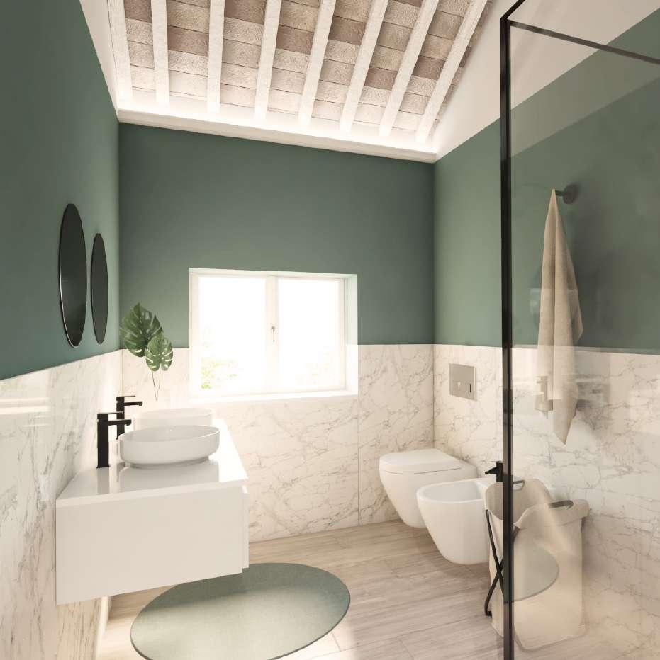 Verde inglese e colori chiari si sposano con il tetto sbiancato e la pulizia visiva dei sanitari.