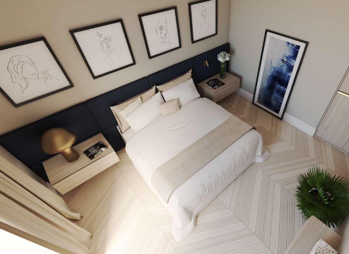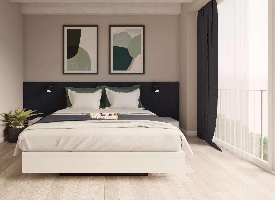 La testiera del letto, invece, è scura, evidenziando la parete che ospita interessanti quadri.