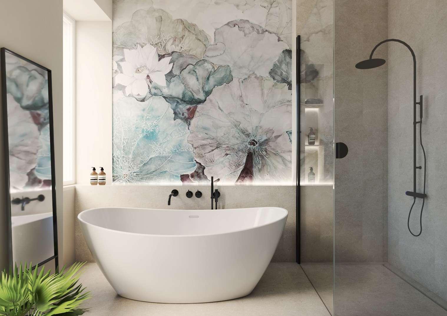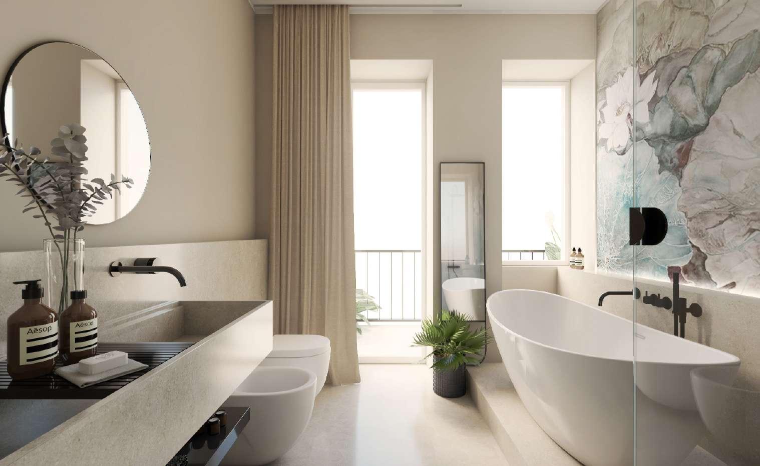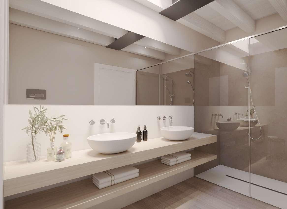 Il bagno è di grandi dimensioni e si inserisce tra le due camere. Ha un doppio lavabo, un’ampia doccia e rivestimenti eleganti e colorati.