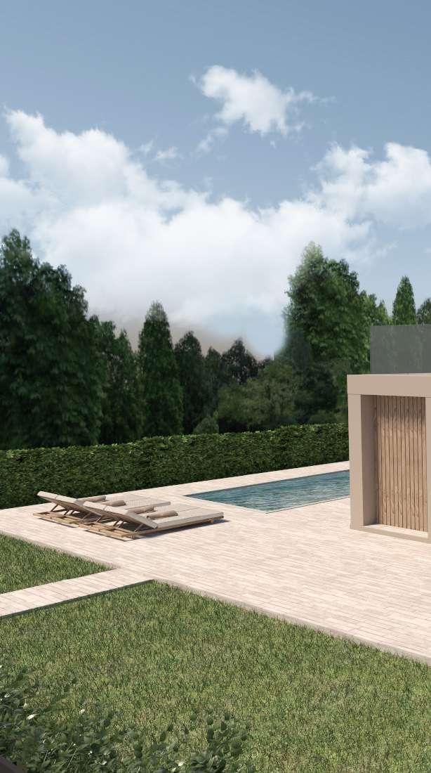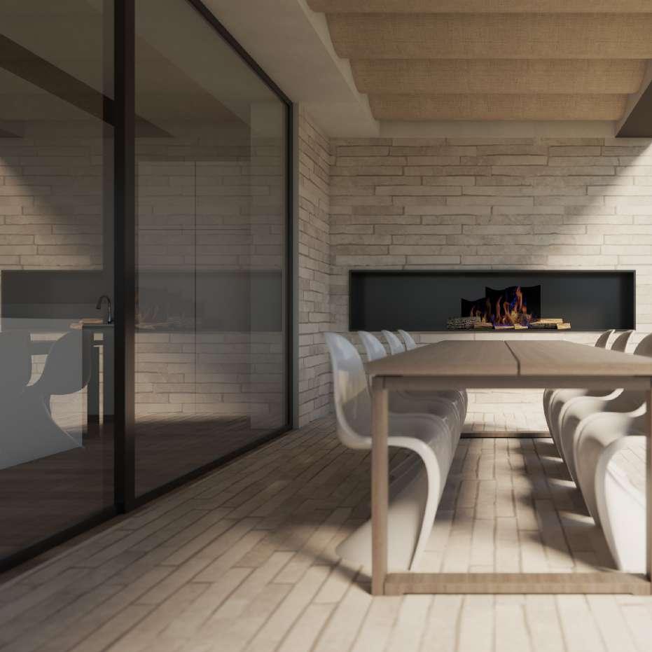 Si osserva la bellezza del portico, con l’ampia vetrata, il pavimento in gres porcellanato effetto legno, il lungo tavolo, per dare continuità alla zona giorno collegandosi alla vista del giardino.