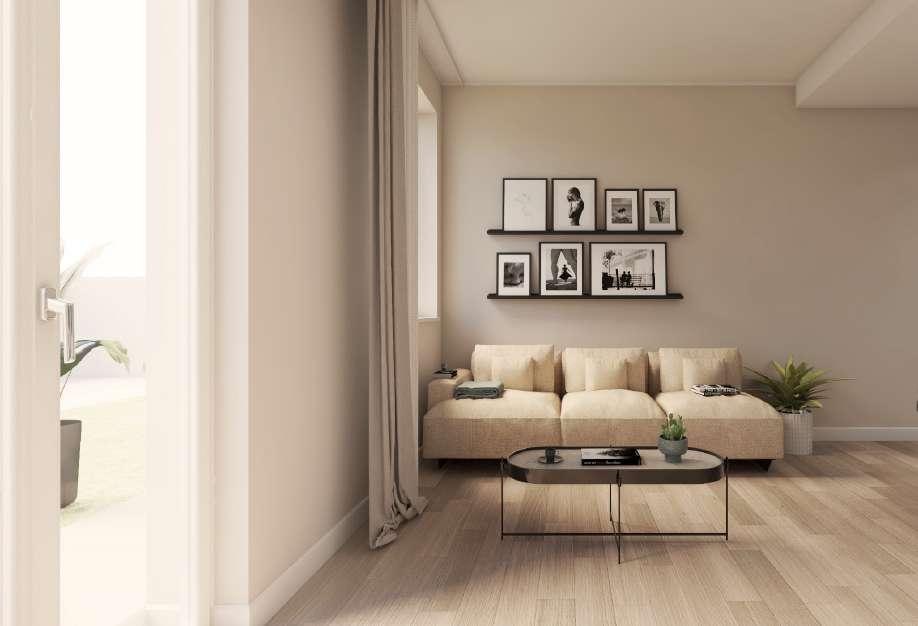 Anche in questo caso, la scelta del materiale ricade sul gres porcellanato effetto legno, abbinato a dei battiscopa bianchi, per un interessante comfort indoor.
