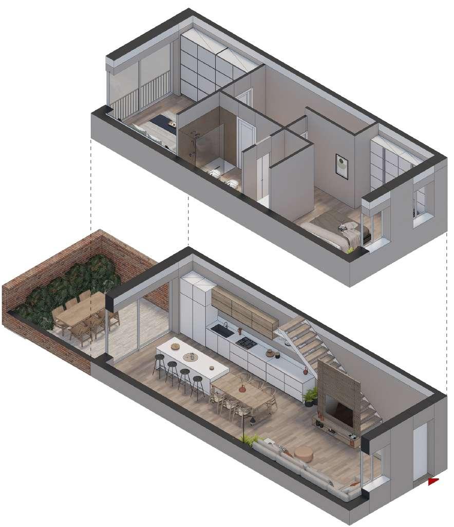 SIAMO A ZEVIO. SOLUZIONI SALVA-SPAZIO SI ACCOMPAGNANO A TOCCHI DI DESIGN CHE ESALTANO IL VALORE DELL’EDIFICIO. IL SOGGIORNO SI APRE SUL CORTILE CON UNA GRANDE VETRATA CHE ILLUMINA TUTTO L’INTERNO. LA SCALA HA UNA PROTEZIONE CHE DIVENTA ELEMENTO DI ARREDO E DÀ CARATTERE ALL’AMBIENTE. IL PIANO NOTTE HA COLORI RIPOSANTI, UN BAGNO ZEN E UNA SUPERFICIE FINESTRATA CHE VALORIZZA IL VERDE ESTERNO.