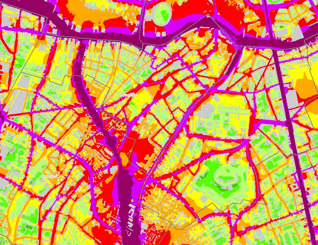 « Cette carte présente les zones susceptibles de contenir des bâtiments dont les façades sont exposées à un niveau sonore moyen d’au moins 68 dB(A) sur 24h. Tous les habitants d’un immeuble au contact de cette zone sont comptabilisés dans les chiffres d’exposition de la population en dépassement de cette valeur limite. »
