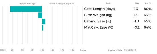 ✓ Equally, bars that lie to the left of the line indicate EBVs/GEBVs that are below Breed Average. The further to the left they are, the further below Breed Average they are.