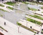 The site's flat, marshland is first zoned into areas of organized, urban activity that rise with public terraces. Pedestrian paths converge onto a central plaza of overlapping marshy water, vegetation and terracing pieces.
