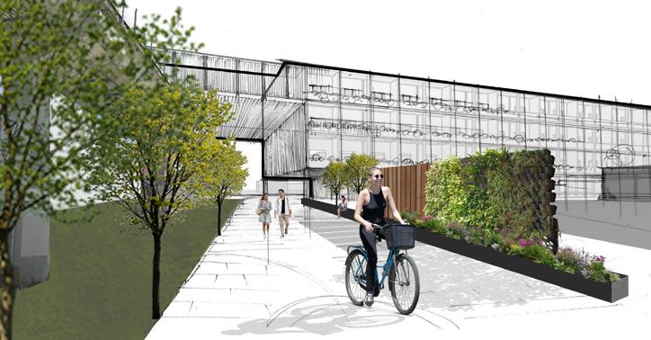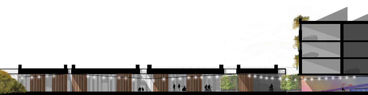 Facilitated passage | art walk, seating, dining buffer | hybrid parking, retail