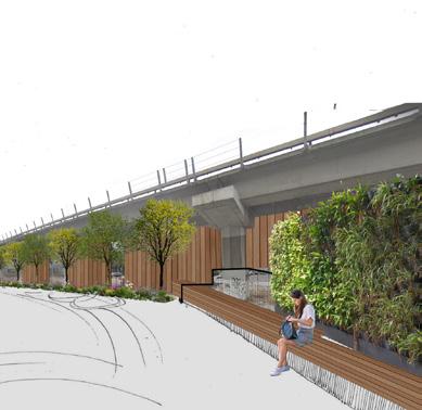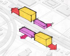 Secondary structures connect residential structures to commercial amenities and insert themselves below the highway.