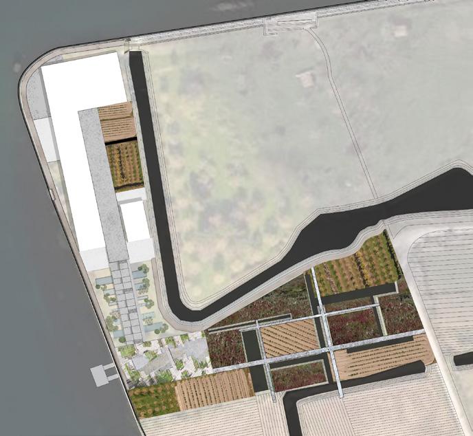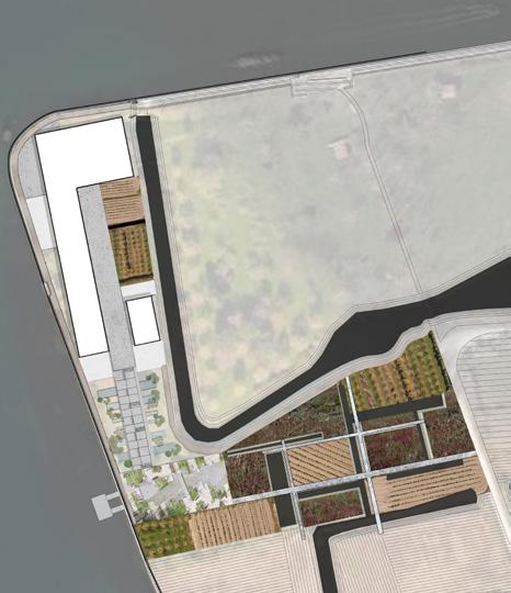 To the south, flexible landscaping privileges free, intimate experiences of the island. Patterns of interactive farmland, water and raised paths speak to the subtle, but nuanced character of the island.
