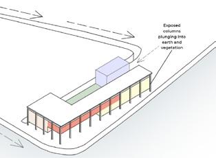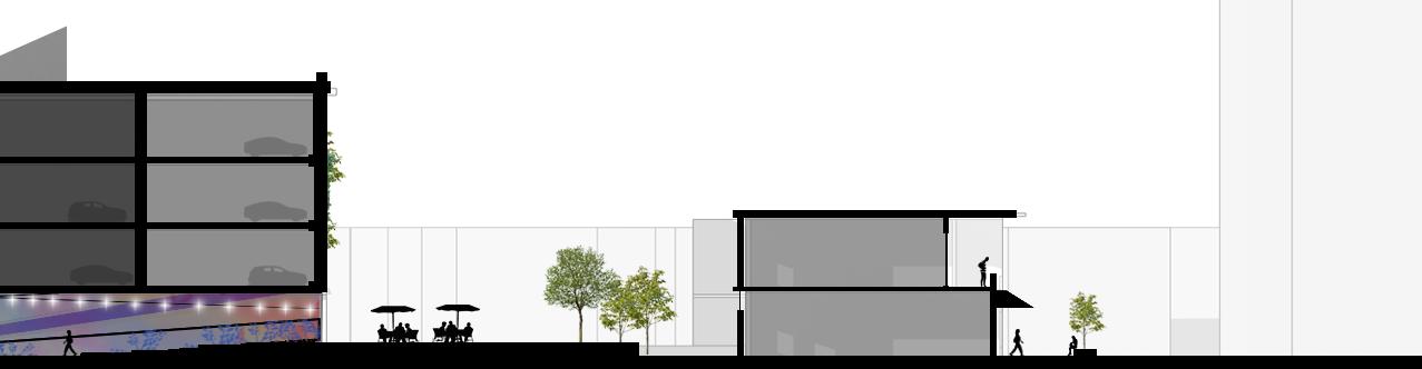 Hybridized structures of parking, commercial and co-working functions target the highway to protect residences behind them.