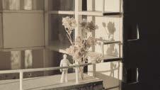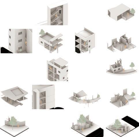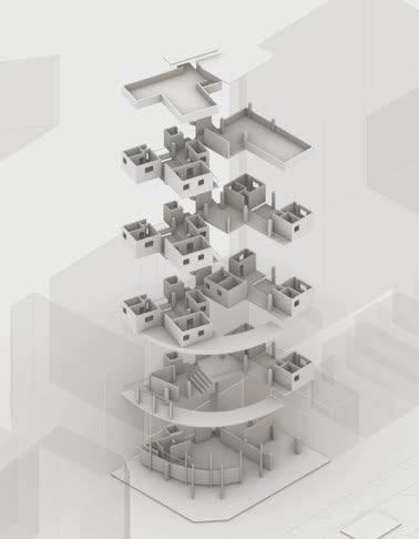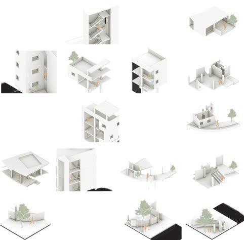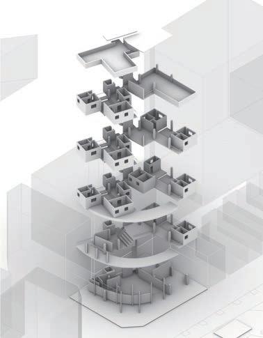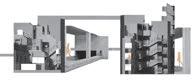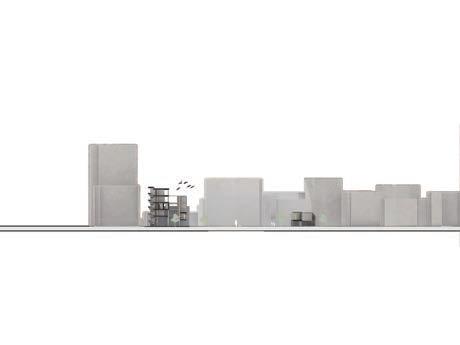 公共空間以基地四面向之介面特性, 分別為缝 開口 柱列 平台, 圍塑不同特性之公共空間, 並於每層皆設置公共平台 使人聚集對話共享