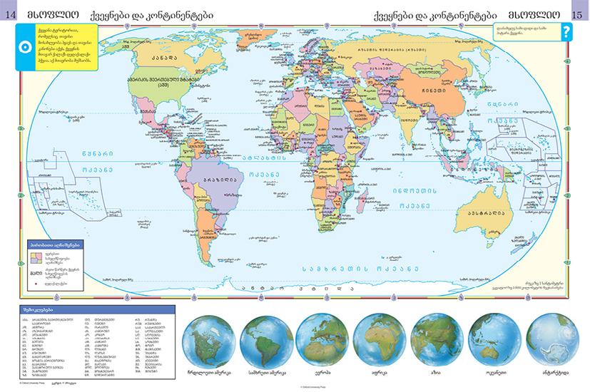 `oqsfordis saerTaSoriso saskolo atlasis~ es axali gamocema Sevsebulia bolodroindeli faqtebiTa da iolad wasakiTxi feradi rukebiT. atlasi Sedgenilia specialuri kvlevis safuZvelze, Tu rogor moixmaren bavSvebi rukas. es aris idealuri wyaro norCi geografebisaTvis. atlasi moicavs iseT ZiriTad Temebs, rogoricaa landSafti, wyali, dasaxlebuli punqtebi, damakavSirebeli gzebi da garemo. mocemulia advilad gasagebi Taviseburebani, agreTve fotosuraTebi da ilustraciebi, romlebic bavSvs ama Tu im adgilis cxadad warmodgenaSi Seuwyobs xels.