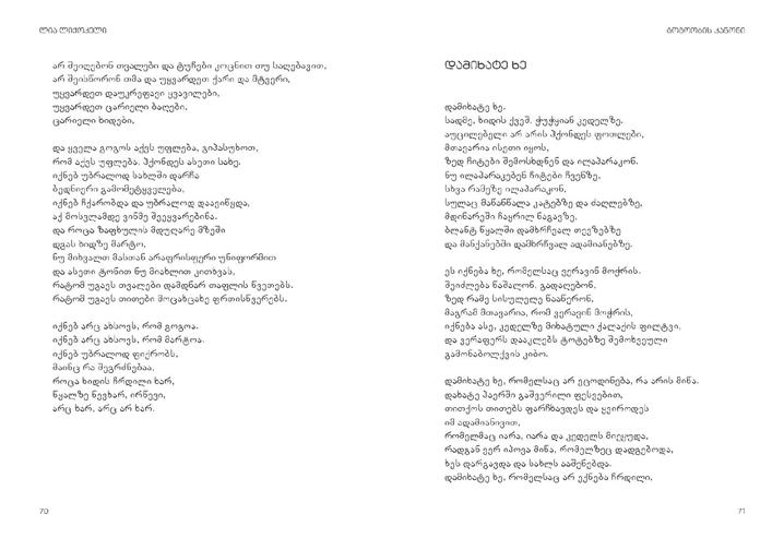 Semdgeneli: lia liqokeli sulxan-saba orbelianidan dRemde, mravali gamoCenili mwerali qmnida teqstebs bavSvebisaTvis. igavebidan novelebamde, jadosnuri samyarodan yoveldRiur, realistur yofamde, es teqstebi yovel epoqaSi asaxavda ZiriTad adamianur faseulobebs – siyvaruls, megobrobas, erTgulebas da Tavisuflebisken swrafvas. am wignSi Tavi movuyareT gamorCeul moTxrobebs, romlebic sami saukunis ganmavlobaSia dawerili da qarTuli sabavSvo prozis erTian, mdidar, ferad xaliCas qmnis.
