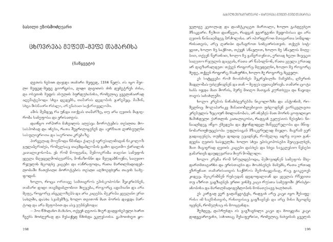 teqsti: leila beriaSvili ilustraciebi: nino CitaiSvili albaT gagigonia sami mamaci raindis – tarielis, avTandilisa da fridonis ambavi. ici Tu ara, vis eZebda vefxvis tyaviT Semosili tarieli mravali wlis manZilze? gsmenia Tu ara grZneuli qajebisa da maTi auRebeli cixesimagreebis Sesaxeb? sami erTguli megobris kavSirs SeuZleblis gakeTebac ki ZaluZs. gadaSale es ulamazesi wigni, romelic Zalze Zvel da saocrad amaRelvebel ambavs mogiTxrobs. es ambavi rva saukunis win genialurma qarTvelma poetma, rusTvelma, leqsad dawera da Semogvinaxa. rusTvelis ena dRes bevrisTvis, gansakuTrebiT ki bavSvebisaTvis, Zneli gasagebia. am wignSi naTlad, sabavSvo eniT, gadmocemulia vefxistyaosnis mTeli ambavi. Cven SevecadeT SegvenaCunebina erTi SexedviT umniSvnelo detalebic ki, romlebic originalur teqstSi saocrad xatovani Txrobis fonze xSirad SeuCneveli rCeba. daxvewili qarTuli eniT dawerili da mSvenieri ilustraciebiT gaformebuli es wigni saimedo megzuri gaxdeba bavSvebisTvis vefxistyaosnis sibrZnis Secnobis gzaze.