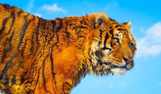 Under blue sky vast Tiger stands, old and weathered Once mighty and strong