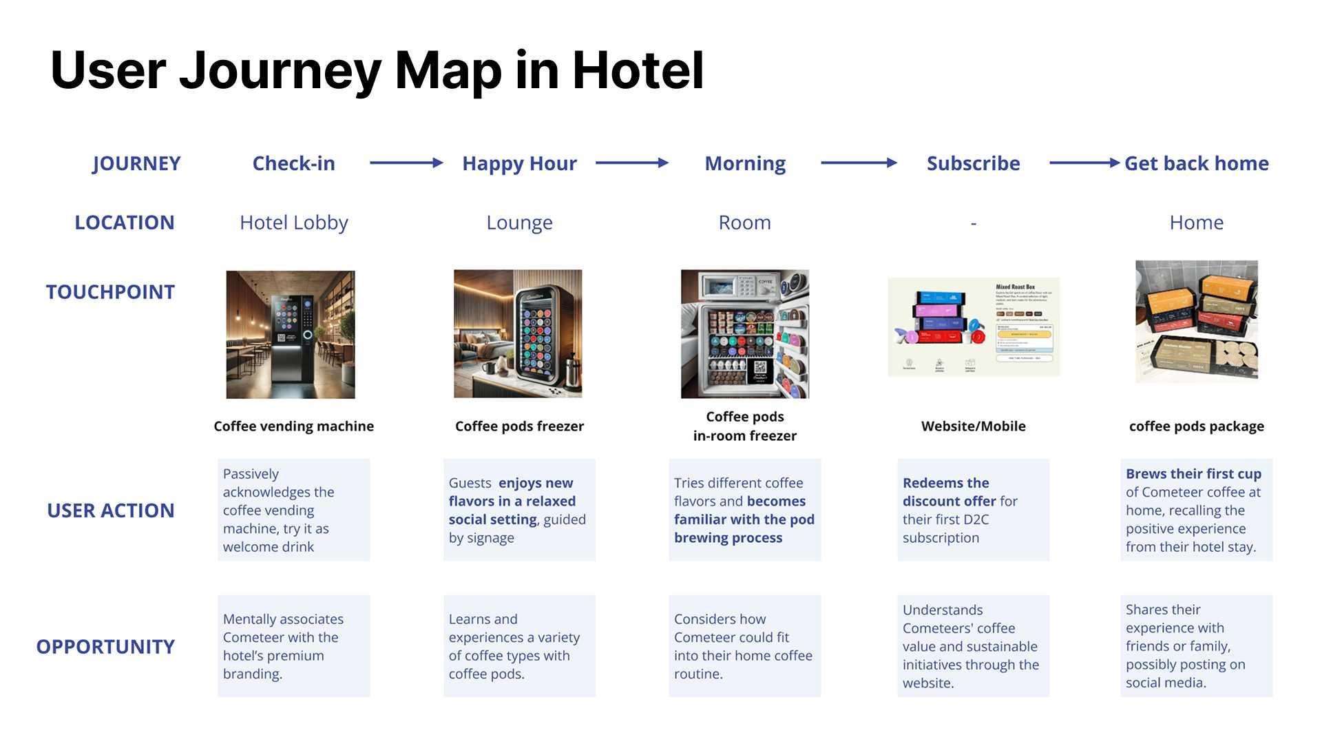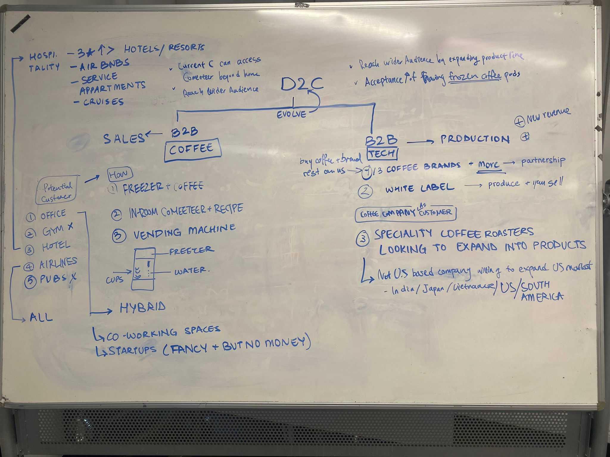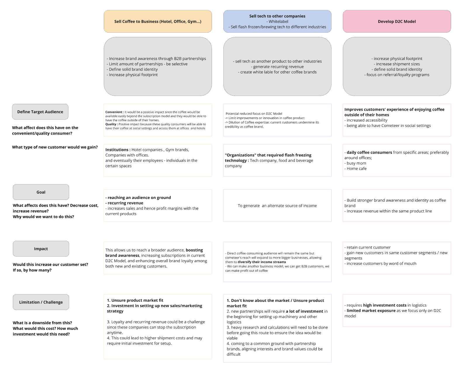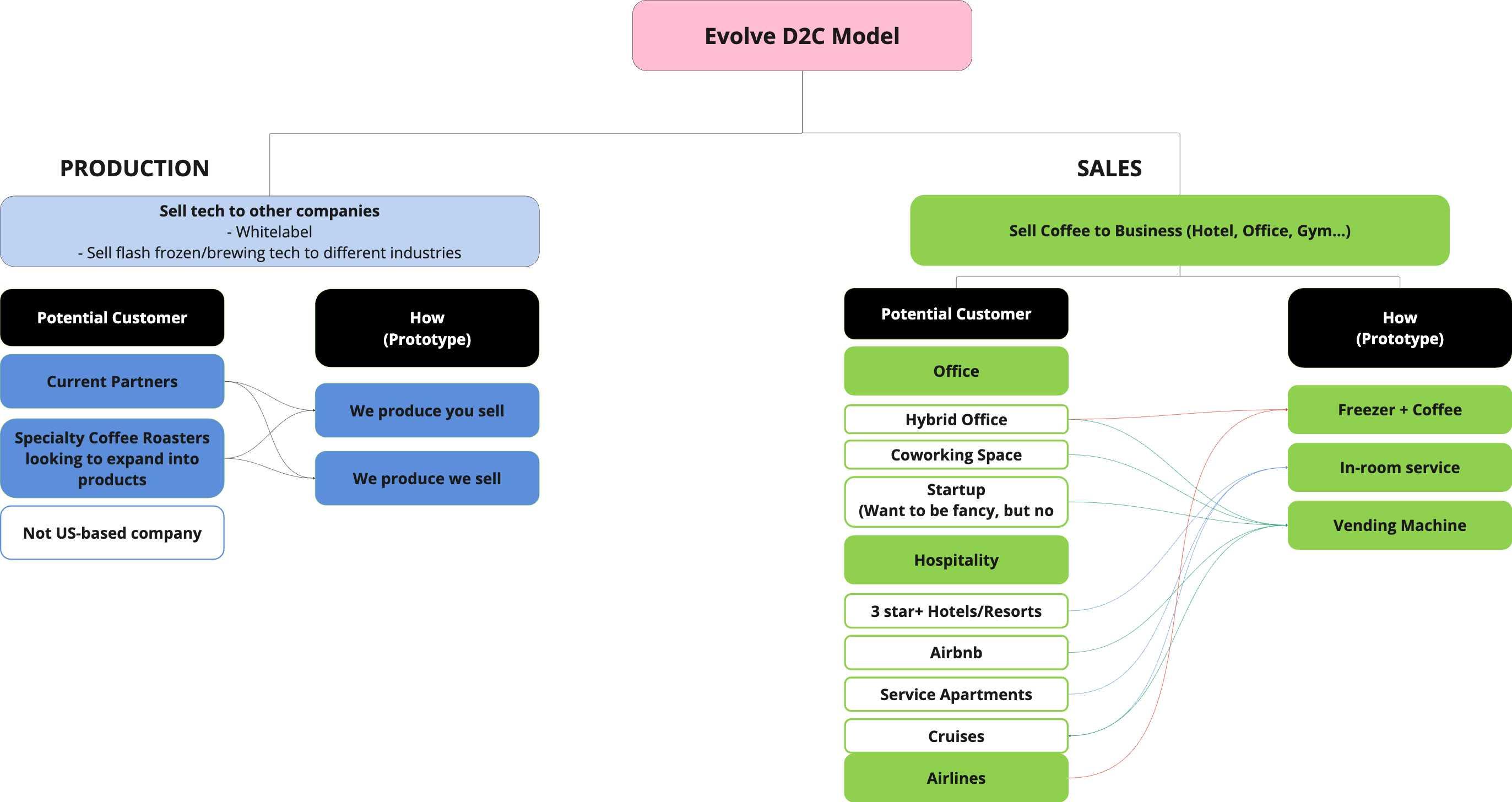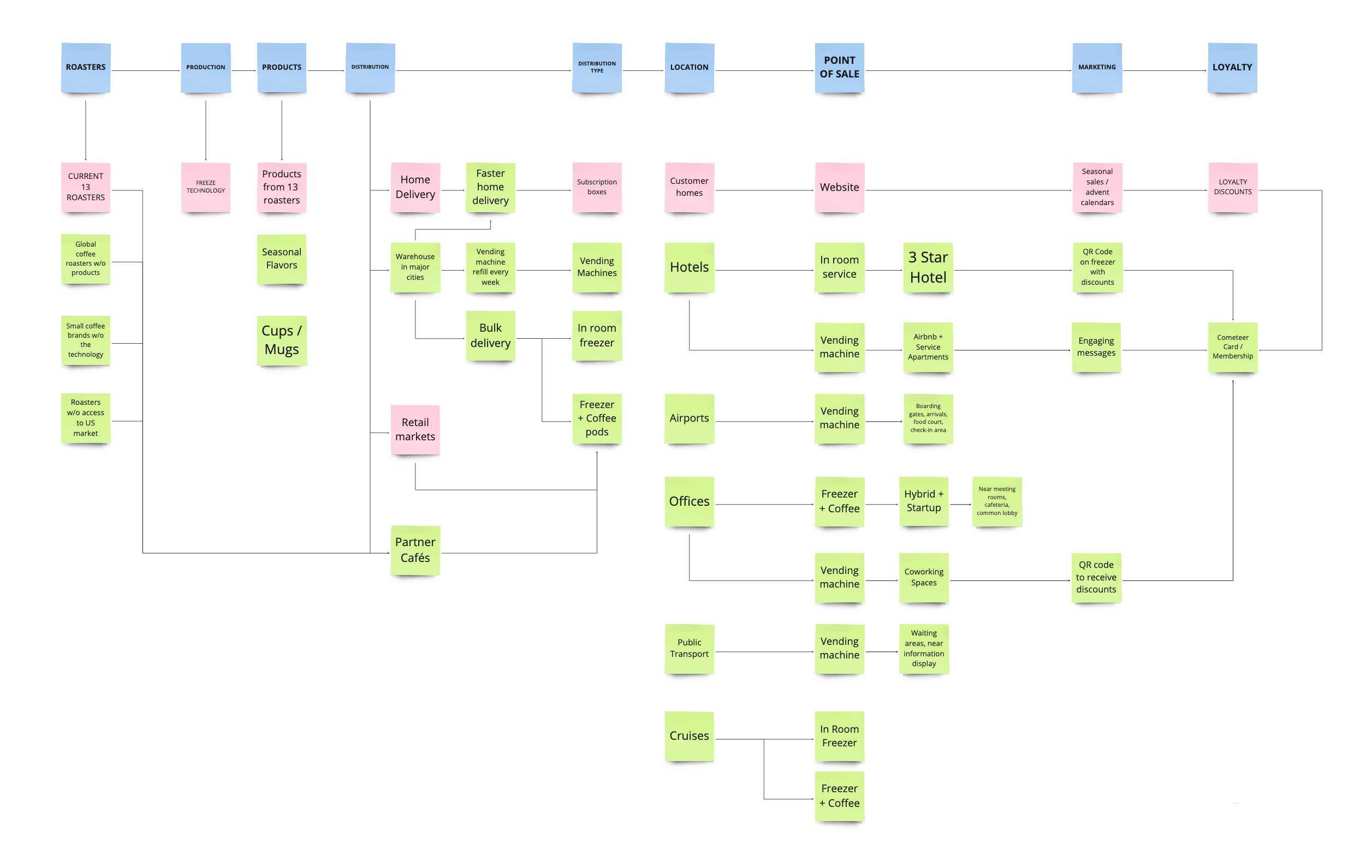 After outlining the key takeaways, we found that they all converged into three overarching strategic directions. Through this prototype the idea is to provide freezers that could be placed in quick access locations where people can grab pods from the freezer and make their coffee; increasing accesebility while providing quality coffee in social setting. While the freezer would be a one time buy, the pods would increase recurring revenue.