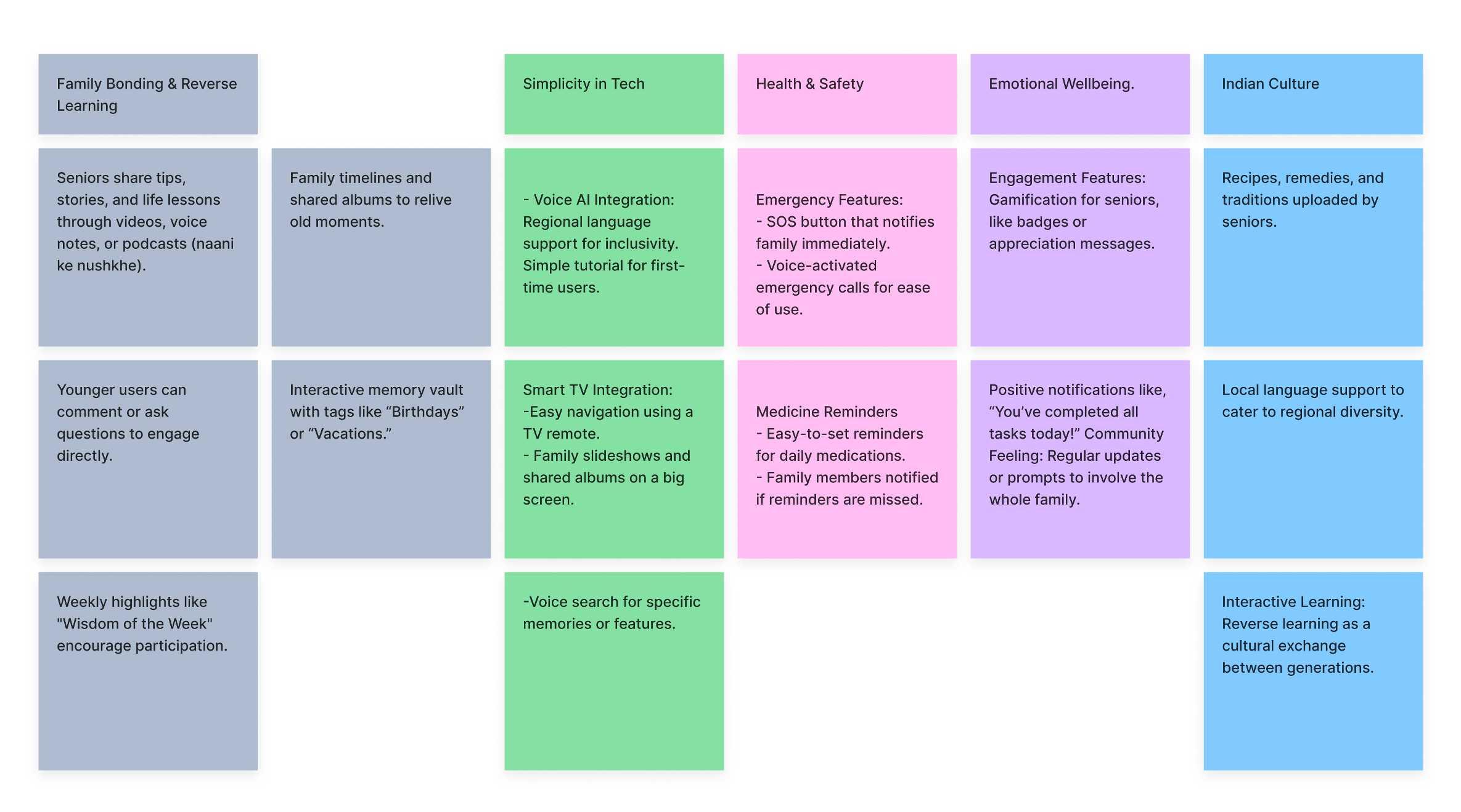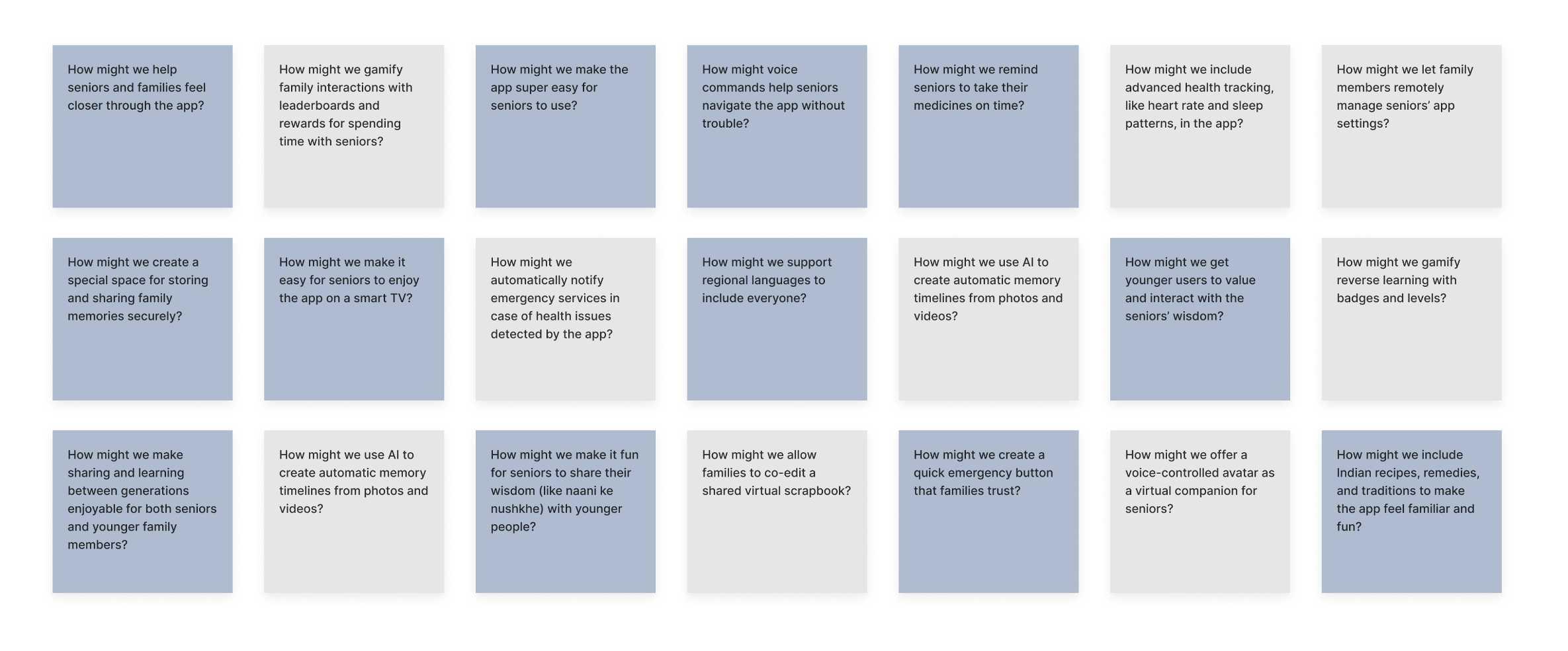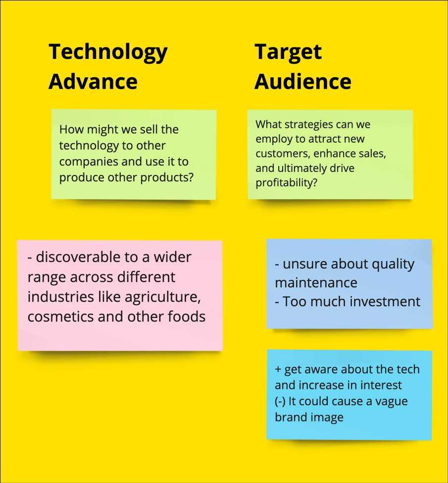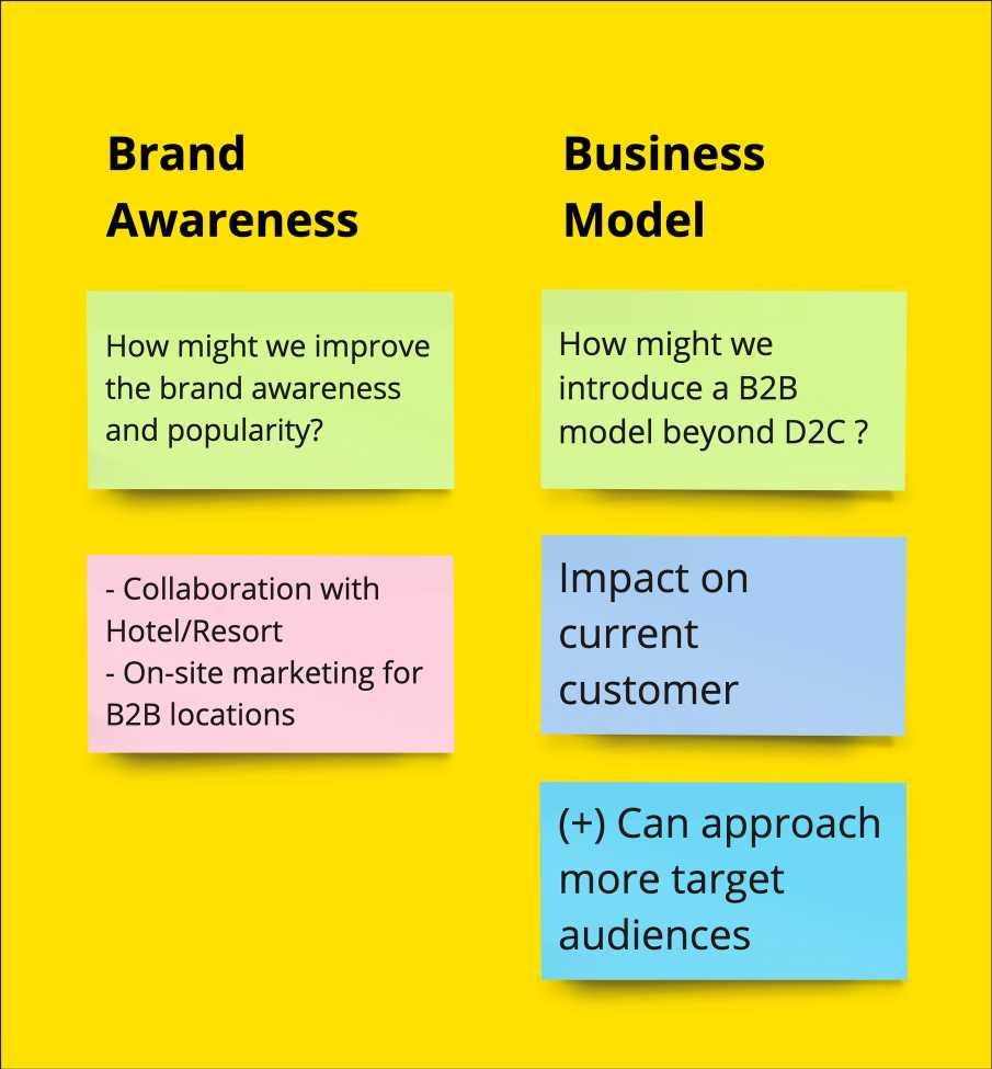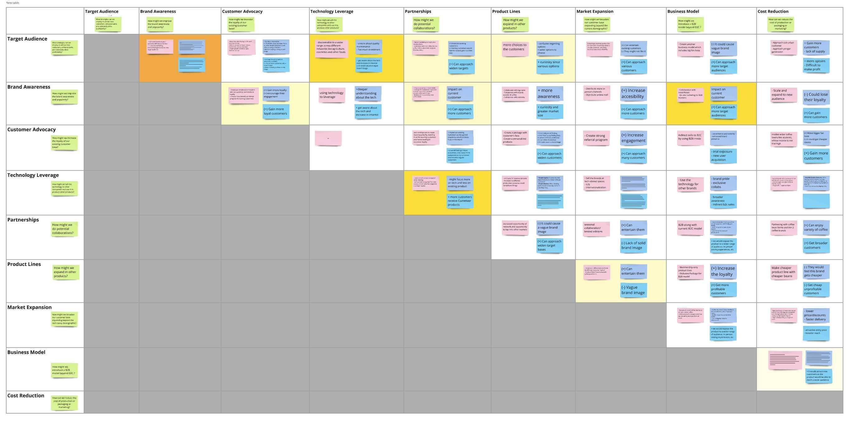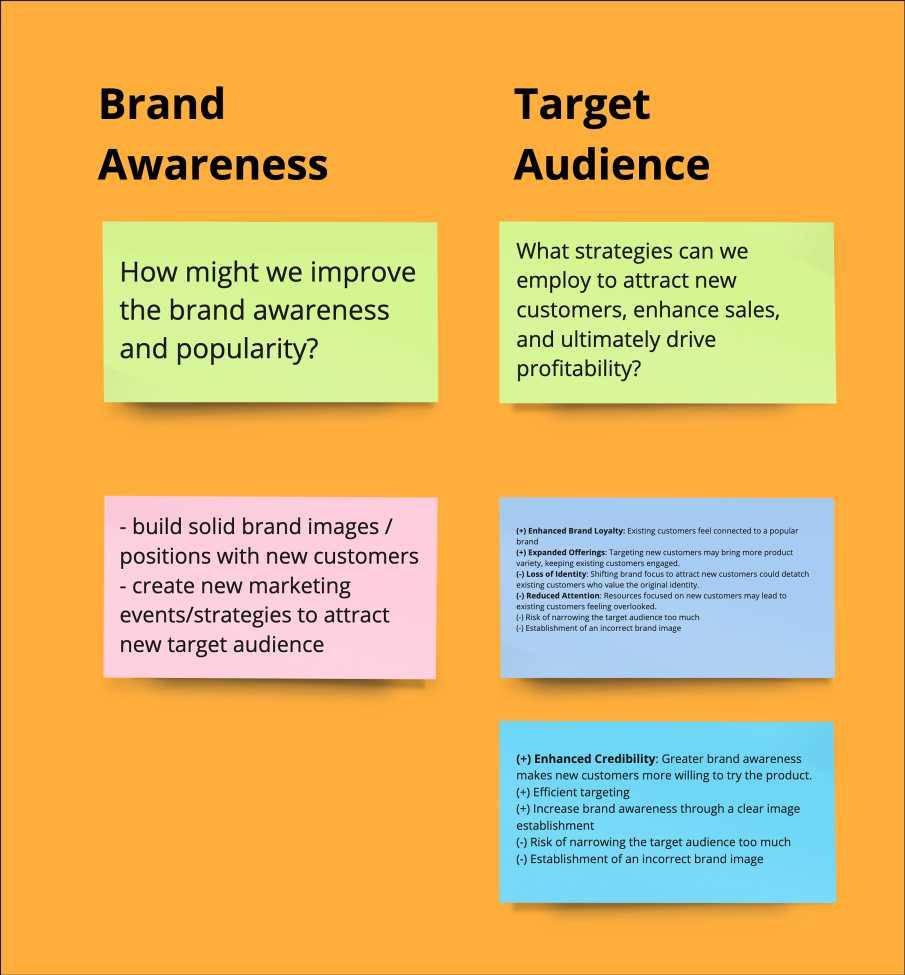 After identifying the target audience, gaps, and insights, we refine key “How might we?” questions and categorize them into thematic groups. These are then mapped onto a heat map, analyzing intersections between buckets to identify strengths, weaknesses, and opportunities—such as how solutions for Target Audience could also enhance Brand Awareness.