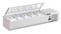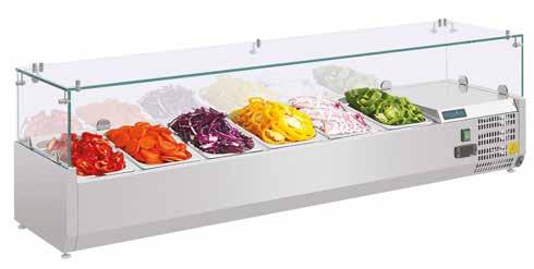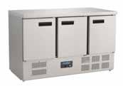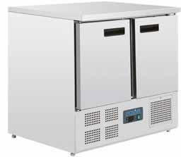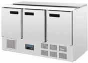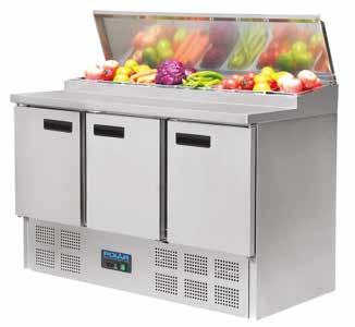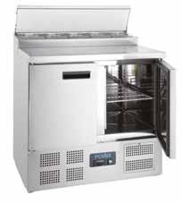 Heavy duty, large capacity refrigerated salad counters with gastronorm storage area. Stainless steel exterior and insulated stainless steel lid. Fully automatic controller with constant digital display.