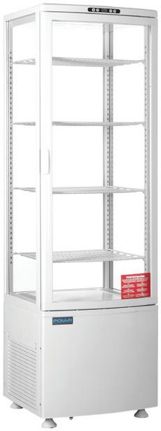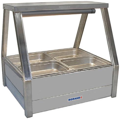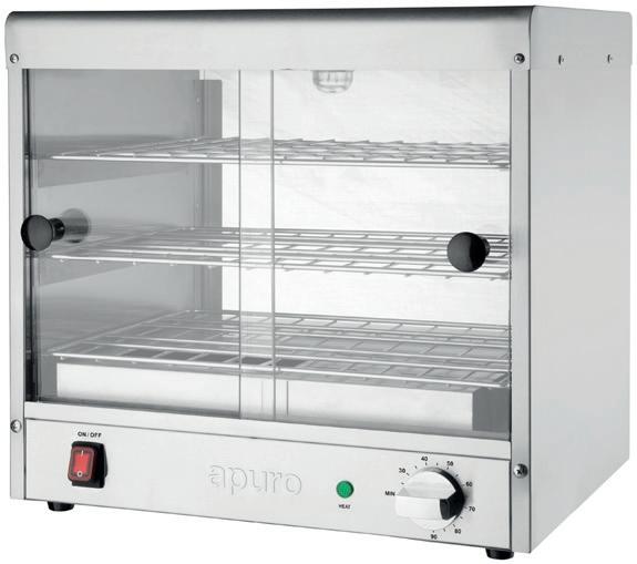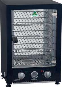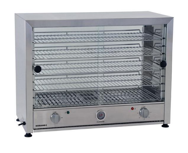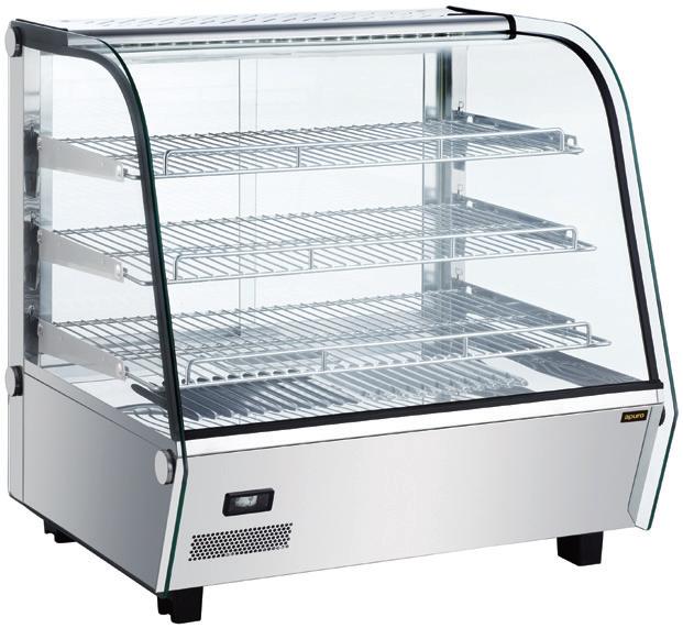 Hold and display cooked pies, sausage rolls and pastries at the correct serving temperature. Stainless steel body, adjustable feet and metal control knobs. Display racks can be installed horizontally or at an angle. Models with an internal light in the ceiling of the machines produce a warm coloured light, further enhancing the appeal and presentation of the food.