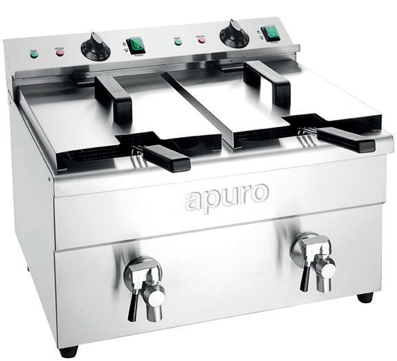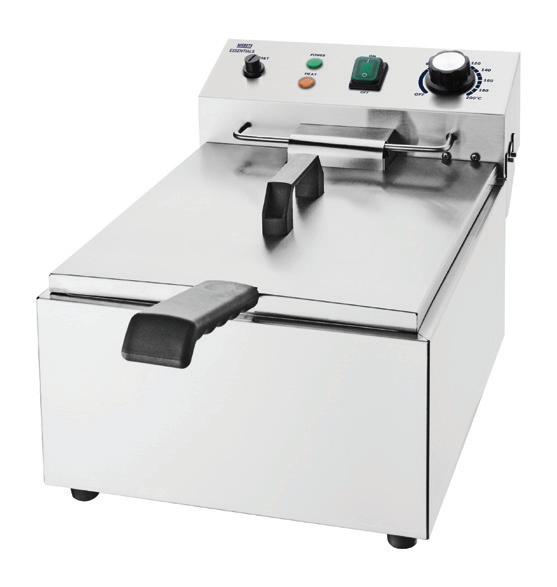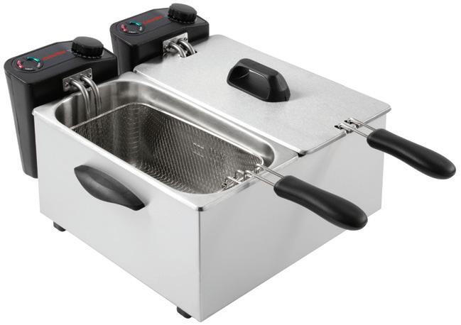Durable stainless steel fryer with variable heat control to accurately maintain desired temperature. Features safety cut out and overheat protection for user safety. Supplied with baskets and lids.