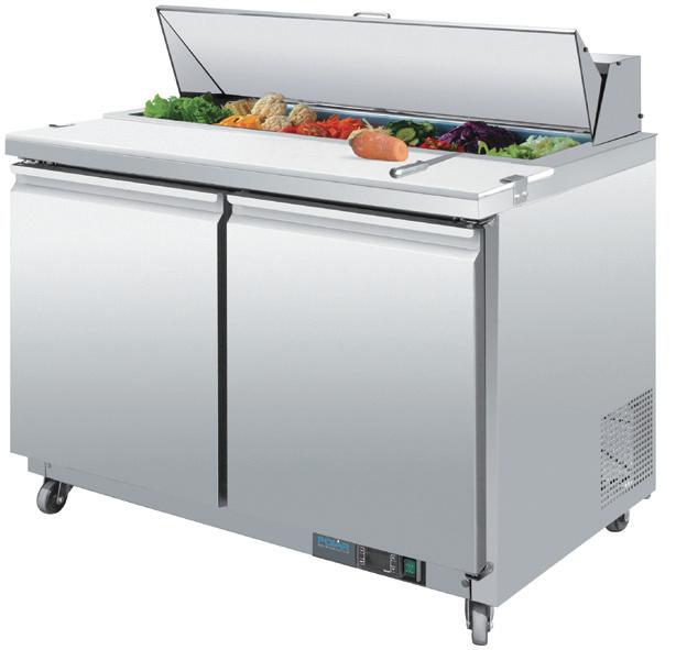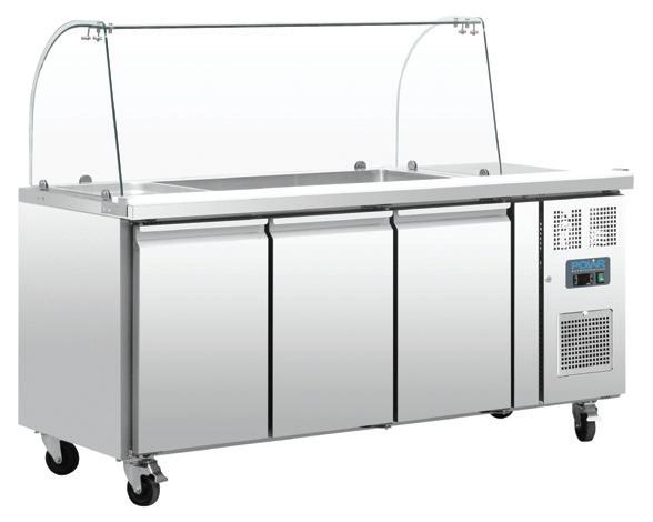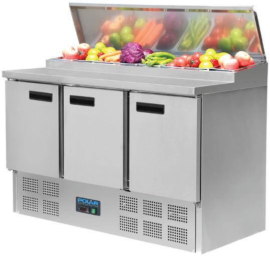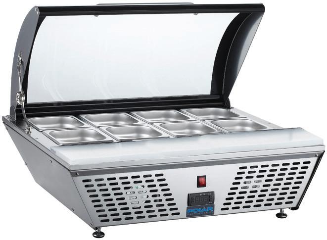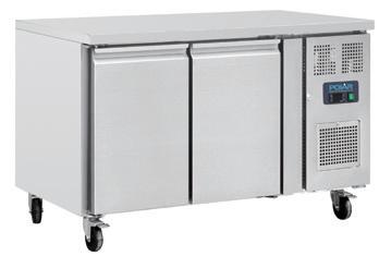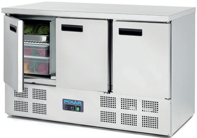 Refrigerated storage counters with stainless steel work surface. Holds up to nine gastronorm 1/1 100mm deep pans. Space saving compressor/condenser fitted underneath. Fully automatic controller with constant digital display. Auto defrost. CFC free.