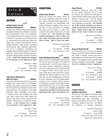 Paper Flowers CFT118 Everything’s coming up roses just in time for your special valentine. Join us in this fun class as you practice the techniques to create beautiful, lifelike paper roses and other flowers in various sizes. You’ll be inspired to create many more for home décor, gifts, even weddings or quiceñeras. The materials fee of $5 includes everything you need to create a small bunch and a template of each flower. Please bring a glue gun and glue sticks to class. Open to teens and adults. Instructor: S. Kronenthal Tuition: $19 W 1 session 2/7