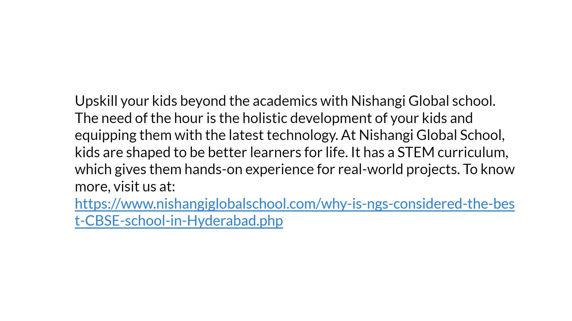 Upskill your kids beyond the academics with Nishangi Global school. The need of the hour is the holistic development of your kids and equipping them with the latest technology. At Nishangi Global School, kids are shaped to be better learners for life. It has a STEM curriculum, which gives them hands-on experience for real-world projects. To know more, visit us at: https://www.nishangiglobalschool.com/why-is-ngs-considered-the-best-CBSE-school-in-Hyderabad.php