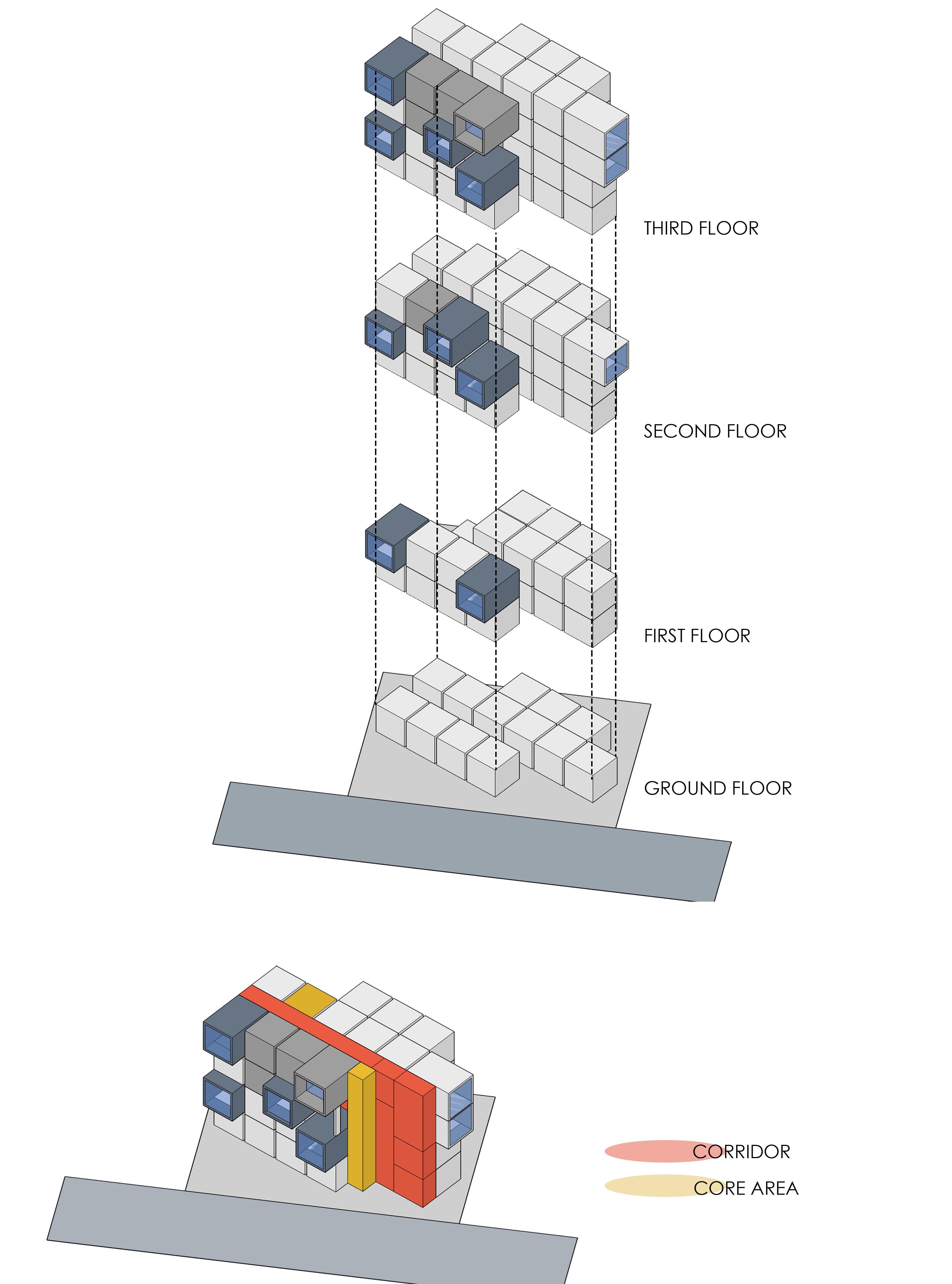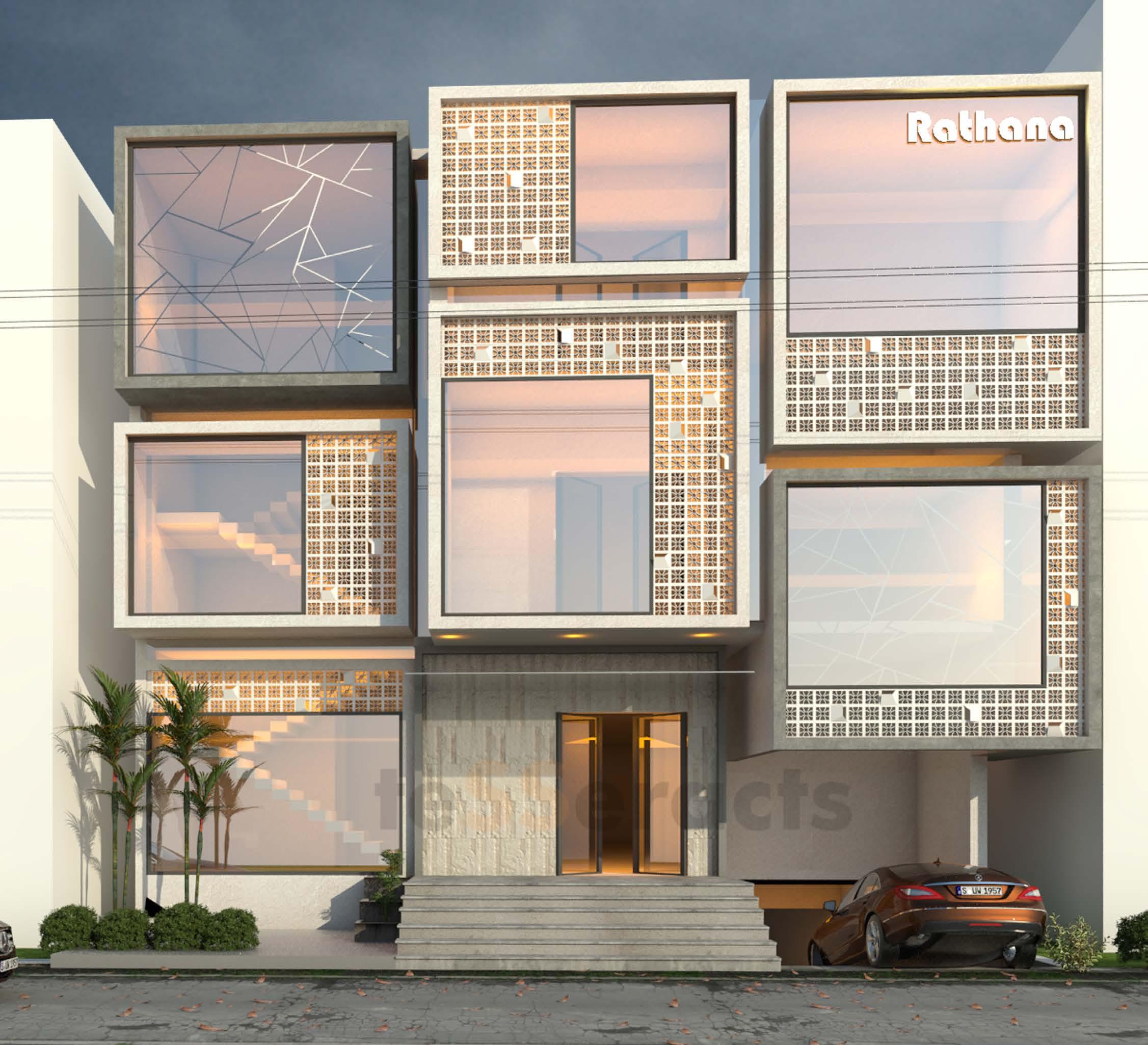 So The initial concept that strikes while designing the commercial complex is voxels. Because the voxcel that create a more usable and functionable space with less amount of facade ornamentation the juxta positioning the space itself bring form to the building.