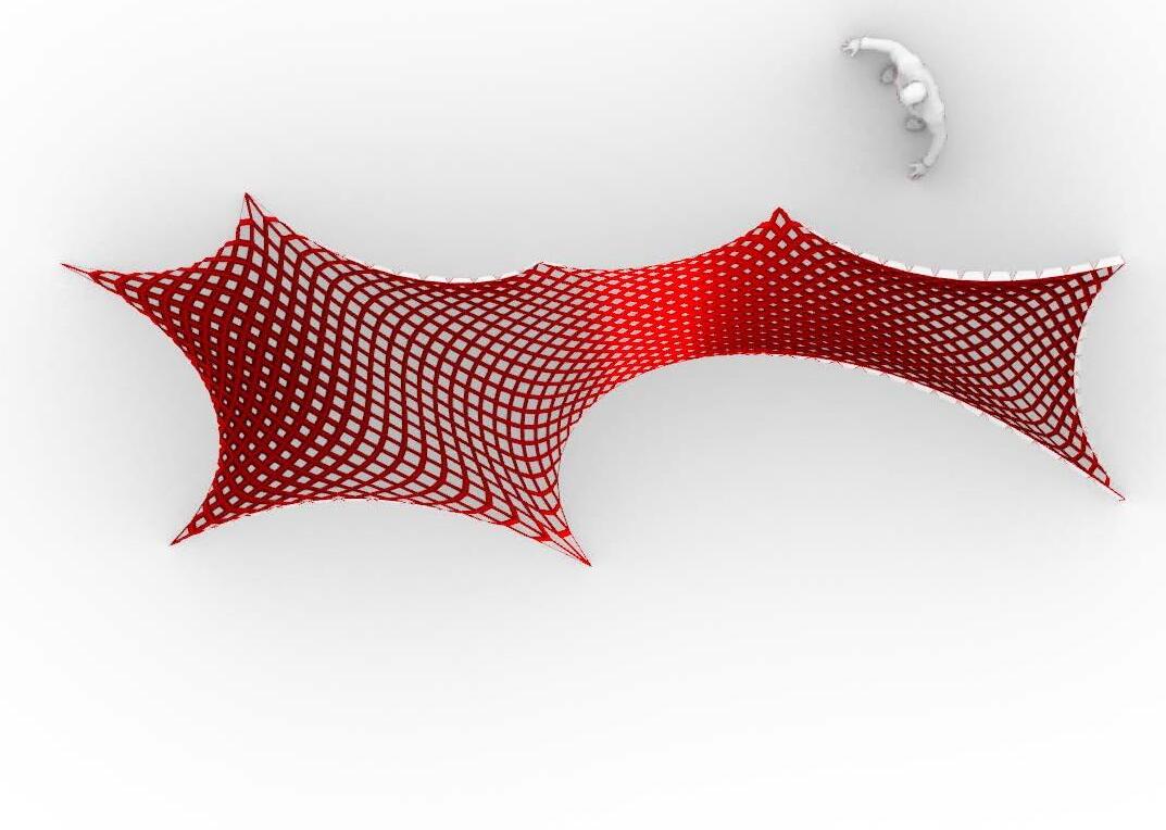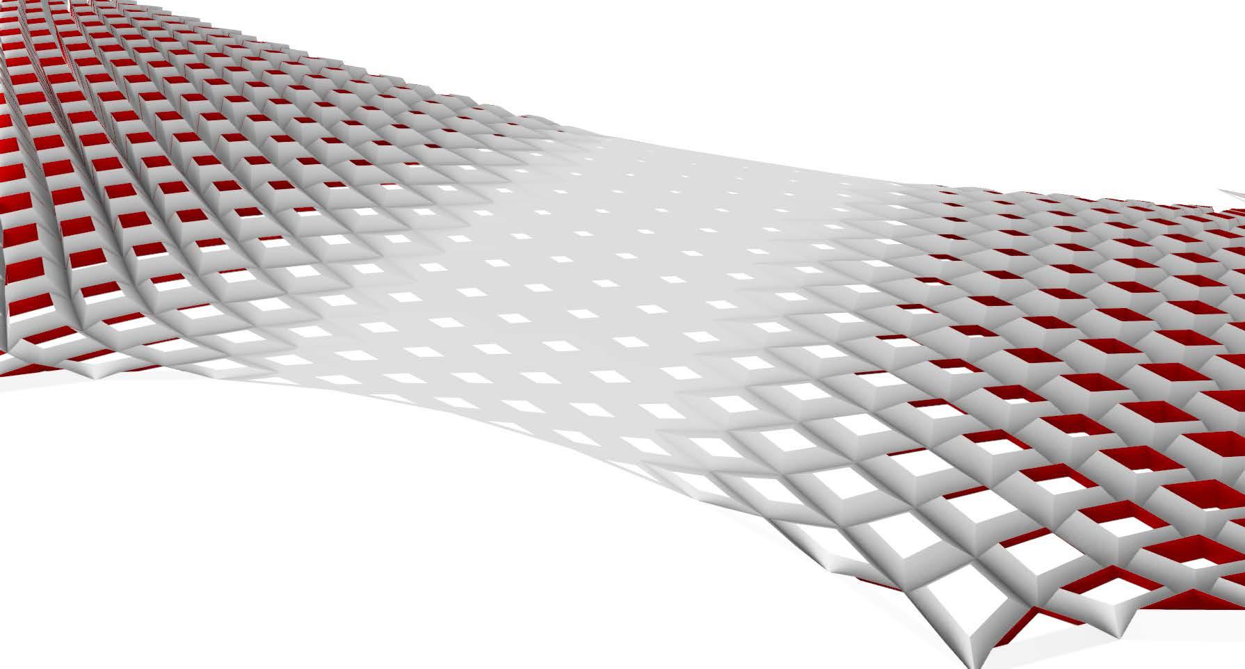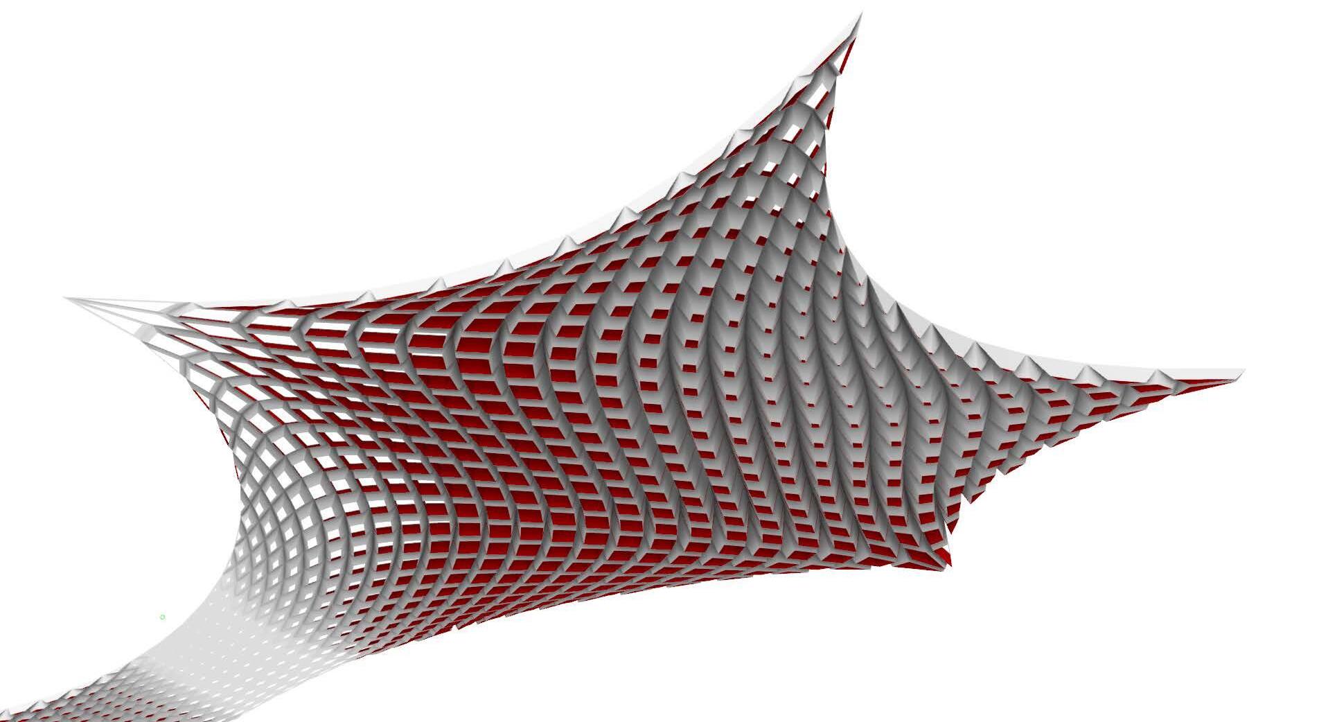 Form Generation: The form consists of a series of intersecting lines creating a grid pattern. The grid appears to be made up of repeating units, possibly rectangular or trapezoidal in shape, which are arranged in a curved, wave-like pattern.