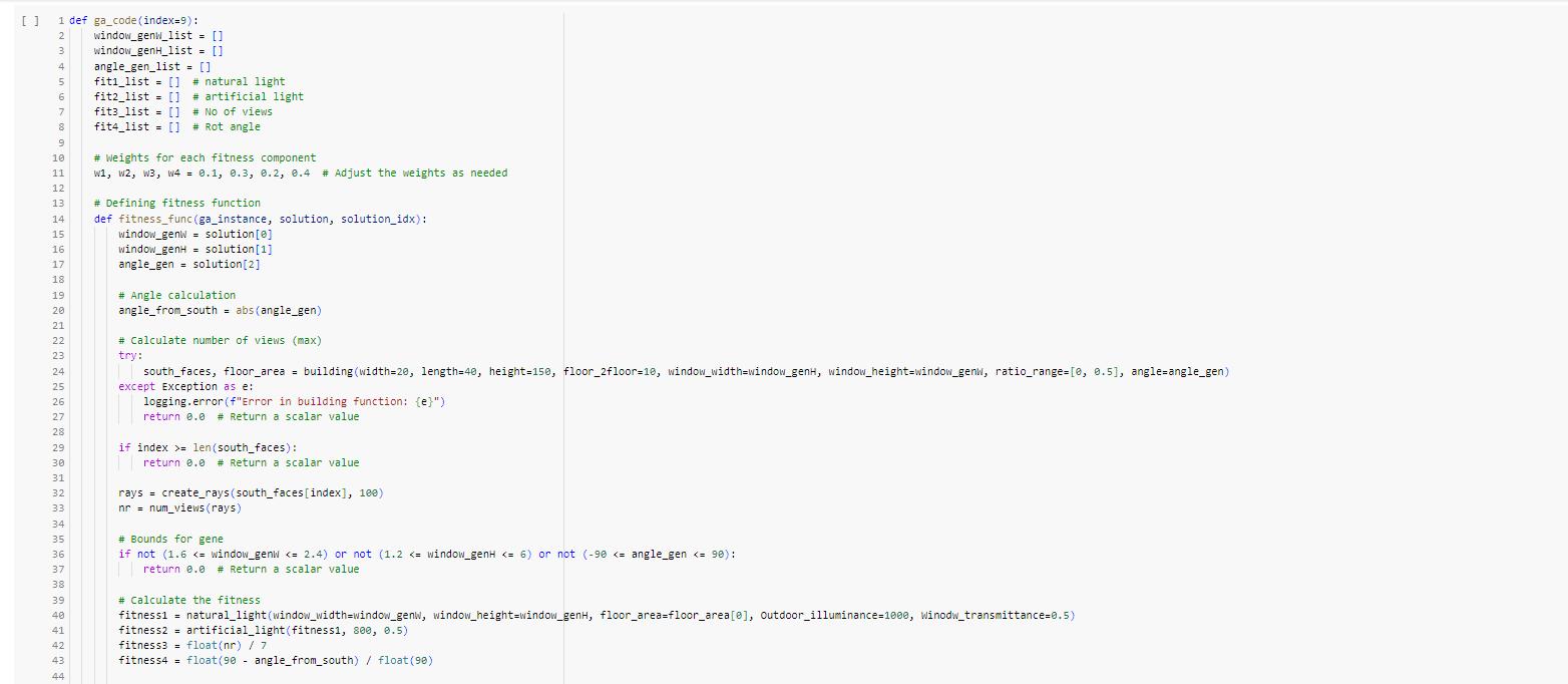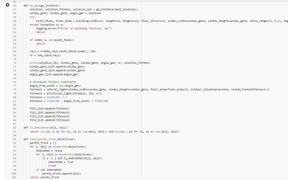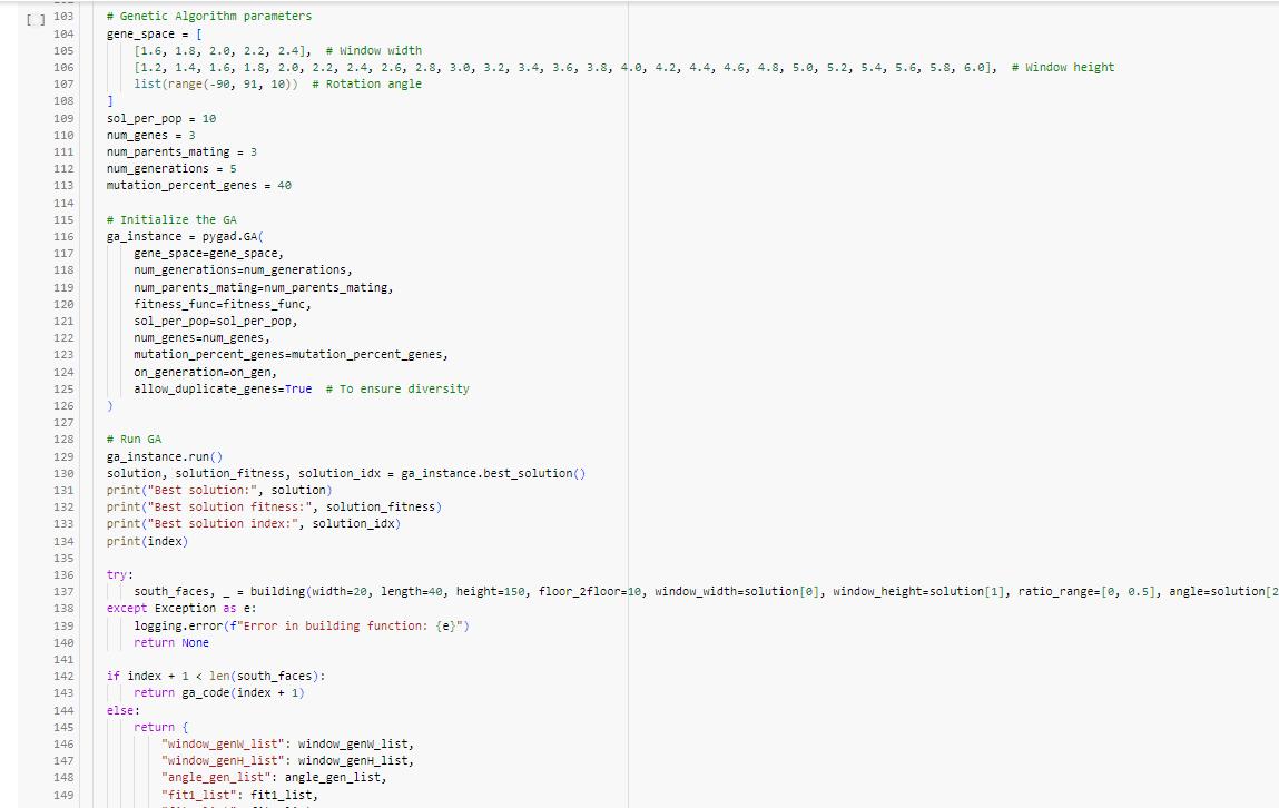 These results showcase the best solutions derived from computational evaluations using the fitness function. Each line represents a set of parameters, such as dimensions and angles, optimized to achieve the highest fitness score. The genetic algorithm iterated through multiple generations, adjusting parameters to maximize factors like light exposure and view quality. The scatter plots visually represent the distribution of solutions, highlighting the most effective configurations. The final best solutions demonstrate the effectiveness of computational methods in architectural design optimization.