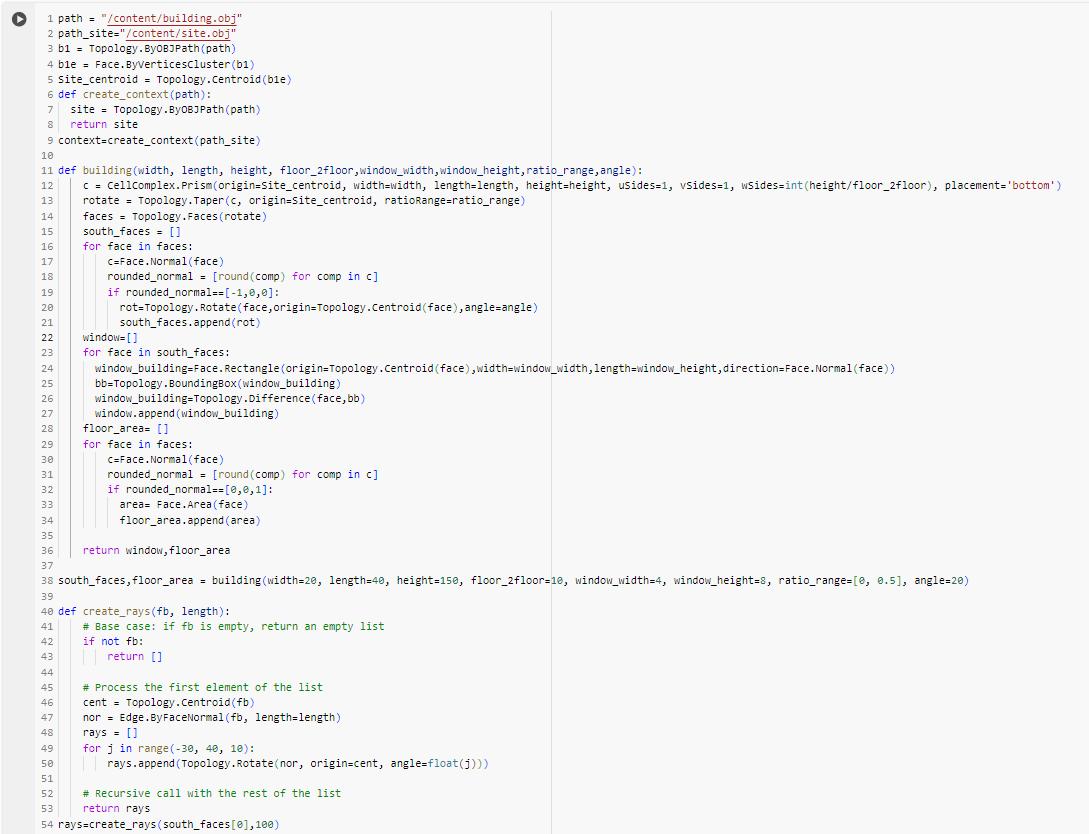 This sheet outlines a computational method for optimizing building design using a genetic algorithm with the Pygad library, applied to a site context in Virginia, USA. The process involves importing the Virginia site context, creating a building model, and calculating views and light using rays. The genetic algorithm optimizes the building’s shape and orientation to maximize the fitness function, which considers factors like light exposure and view quality, ensuring the best design solution for the specific site.