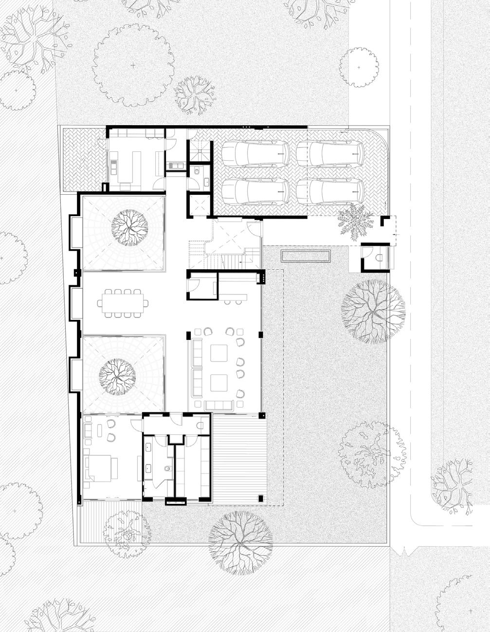 This 7500-sqft resdence is under construction in a quiet urban setting. The site faces East, with a lot of saptaparni trees, which were carefully conserved while designing the house. Keeping Vastu in mind, the house was designed to overlook the garden; multiple iterations later, the built space was positioned along the west wall of the site, with a 30’ wide garden running along the length of the front. This resulted in wrapping the house around the 2 big trees, which allowed us to create to courtyards within the house, bringing the garden into the house. Everything else inside the house was designed overlooking the courtyard. The house has sense of earthiness and openness, while retaining a sense of privacy. The double heighted foyer, the open corridors and the courtyards bring in abundant natural light, adding to the feeling of airiness. The structure was designed to avoid columns at the corners of the courtyard, giving a glorious corner opening sliding windows detail. The house also has a small pool on the second floor, with a large circular opening above it in an attempt to appreciate the form and bring in skylight. We also introduced wooden ceilings in the main areas for a more luxurious look.