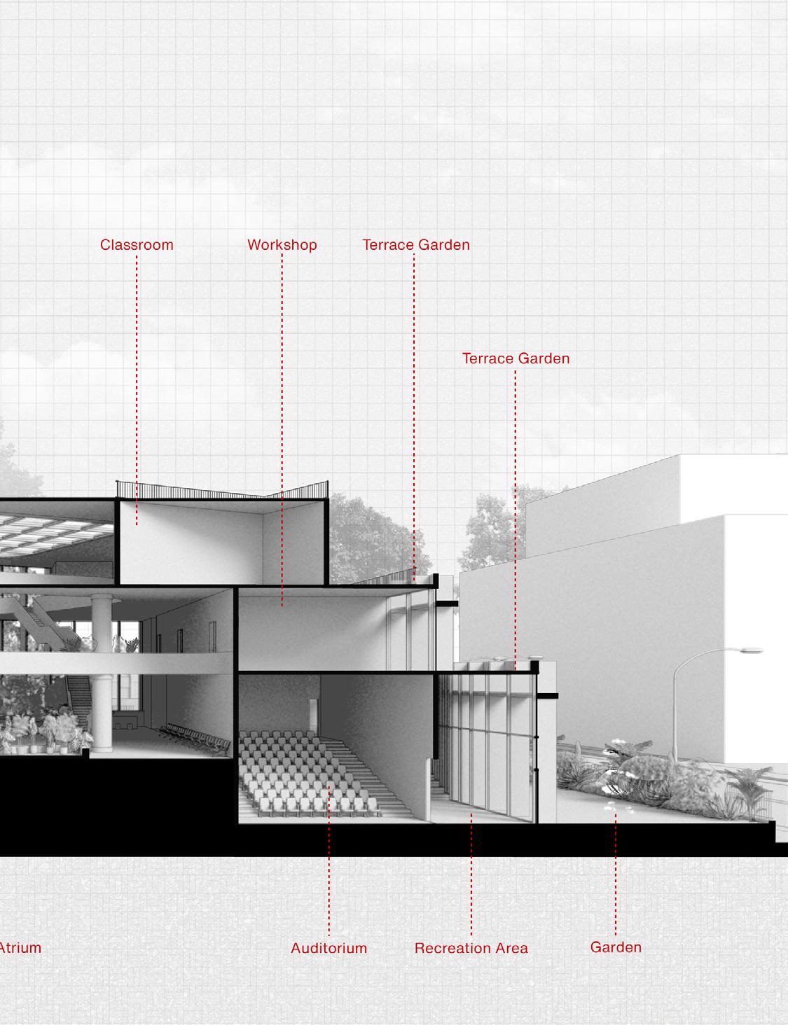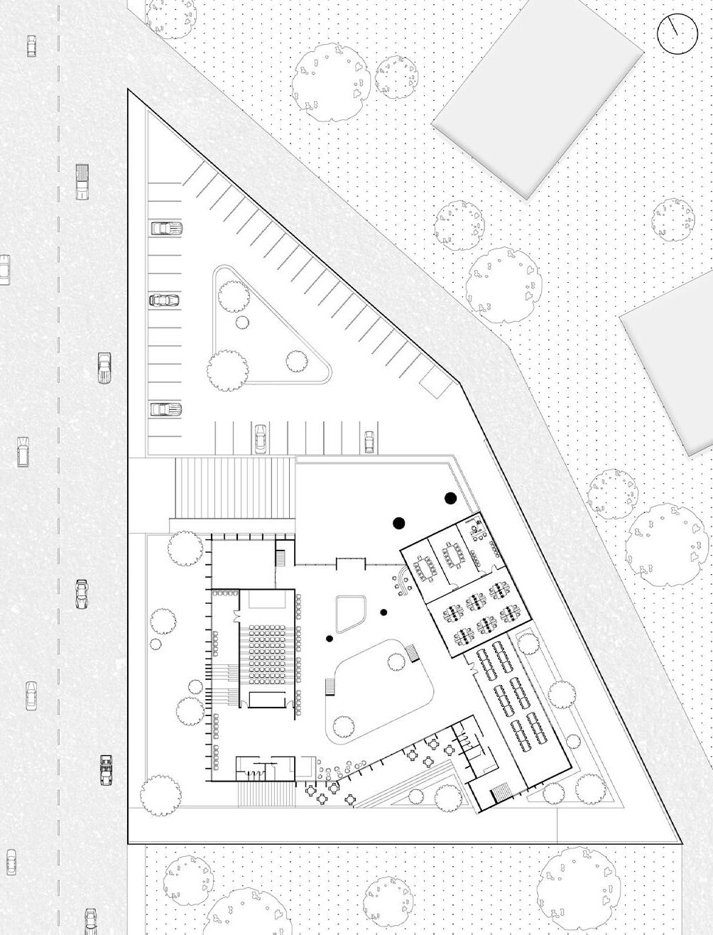 selected works | 2020-2023 Studio Project | Academic Work 45 Site Plan & Ground Floor Plan. 1 20 19 17 18 2 3 7 10 11 16 12 13 1 2 3 4 5 6 7 8 9 10 11 12 13 14 15 16 17 18 19 20 Entry Lobby Exhibition Room Conference Room Admin Office Office Auditorium Recreation Area Courtyard Waiting Area Toilet Cafe Outdoor Seating Toilet Canteen Garden Parking Vehicular entry Site Entry Site Exit 15 14 9 4 5 6 8