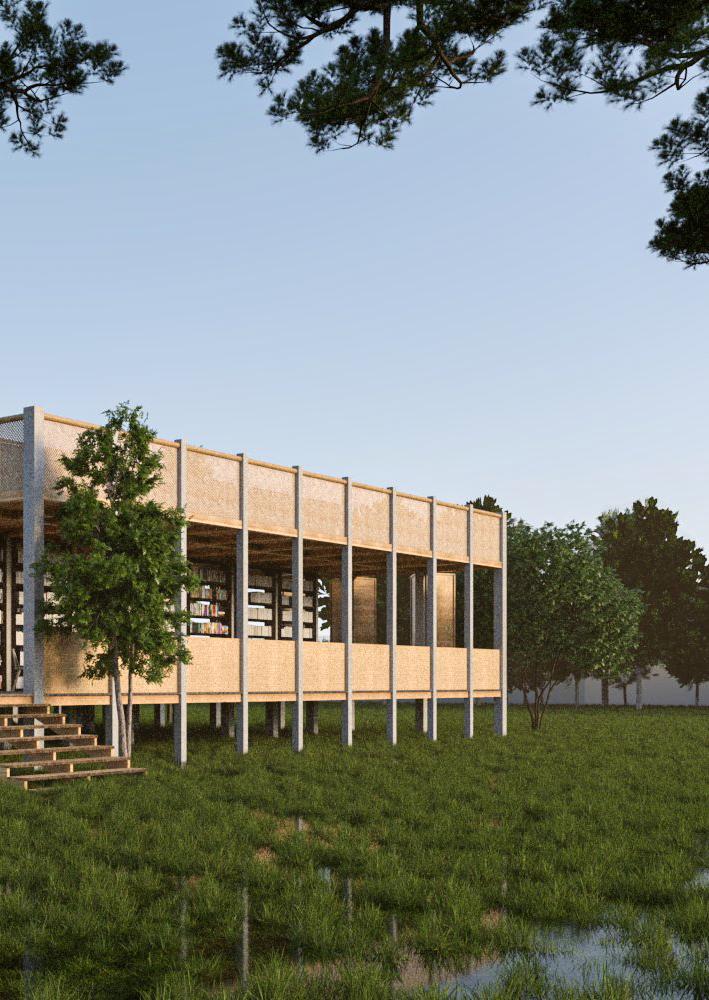 The village of Asharikandi, located in Assam, India, is famous for its terracotta arts and crafts. It is one of the very few places in India still involved in the practice. however, with a majority of the younger population moving out in search of jobs, this form of art is now on a decline. Situated on the banks of the Bonmai river, Asharikandi is vulnerable to annual floods, causing havoc and destruction, taking along with them the terracotta idols and pottery made by the locals. The village also ranks low in literacy, making it the perfect place for the construcion of a small library that would contribute to the development of the village. The idea behind the design was not only to provide a space for education,but a safe working and storage space for the villagers’ crafts. The site is located in the densest part of the village just infront of the school and a few meters away from the Terracotta museum. The library consists of reading spaces, a working space with a kiln, storage spaces and a balcony to dry the terracotta crafts.
