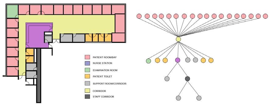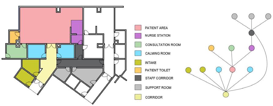 • Traditional ED Psychiatric Ward : In the traditional ED ward, spatial programming follows a corridor-centric layout, requiring patients and staff to navigate the corridor to access rooms, leading to linear and segmented flow. This design can cause inefficient space utilization and bottlenecks, reflecting a compartmentalized approach that limits spatial connectivity.and accessibility.