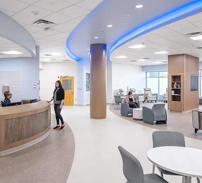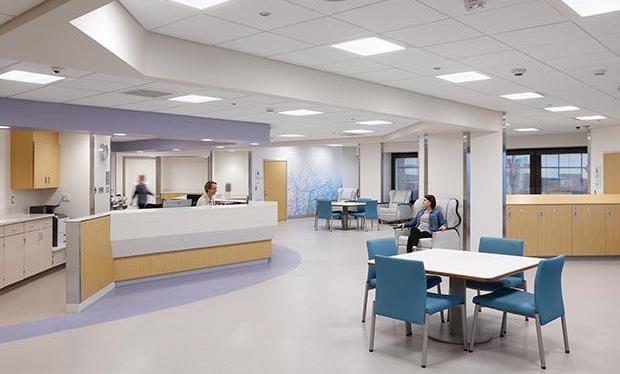 • Patient spaces: Recliners with 40 sq. ft. of personal space promote comfort and reduce confinement. Tables encourage small-group interactions.