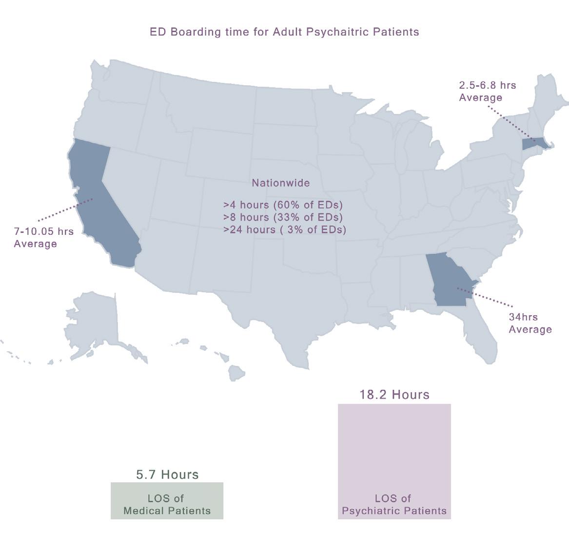 schizophrenia, depression, or substance use disorders, according to the National Alliance on Mental Illness. This growing mental health crisis has led to a significant rise in behavioral health emergencies in hospital EDs. Currently, behavioral health patients comprise 1 in every 8 ED visits, with average stays exceeding 30 hours (Weiss, Barrett, Heslin, & Stocks, 2016). Despite recognizing their responsibility to provide quality care, hospitals face challenges due to insufficient mental health planning and funding at state and local levels.
