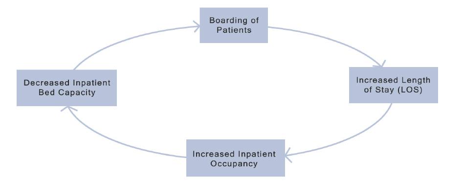 Figure 3: The Vicious Boarding Cycle: Visualizing the interconnected challenges of boarding, length of stay, occupancy, and bed capacity in healthcare.
