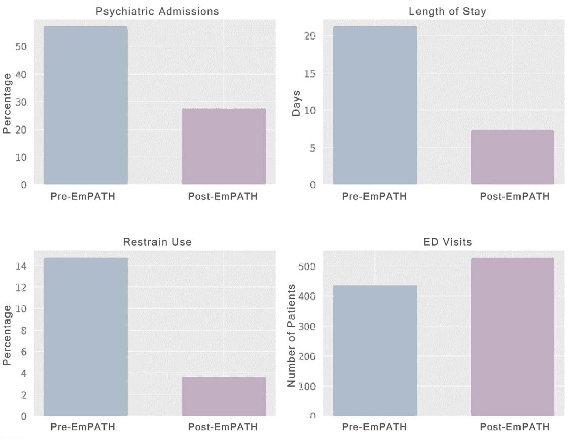 Rapid evaluations by psychiatrists facilitate the integration of care with the development of comprehensive care plans tailored to each patient’s needs. This approach, along with constant observation and re-evaluation, significantly increases the likelihood of patients being diverted from hospitalization. Additionally, the EmPATH unit aims to eliminate restraints, typically reducing their use to far less than 1%, thereby minimizing trauma and promoting dignity and respect in patient care.