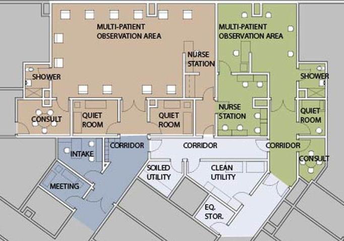 a therapeutic stabilization and treatment space has proved to reduce average length of stay for many patients. an open area provides space for a variety of patient activities and direct visibility of patients by staff.