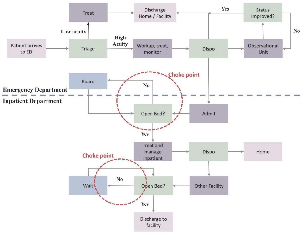 The combination of these factors leads to a classic bottleneck phenomenon, resulting in the prolonged stay, or boarding, of patients in the ED. This situation arises when a patient needs to be moved to an inpatient unit for further medical or psychiatric evaluation but cannot be admitted due to the lack of available beds. This shortage creates the bottleneck, with patients waiting in the ED until a bed becomes free (workweek, 2022).