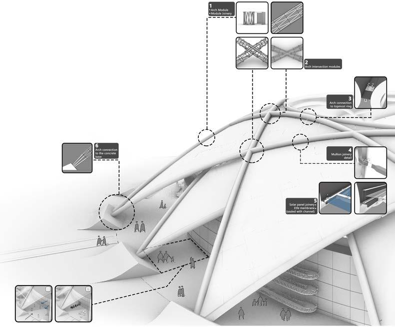7. Introducing solar panels on most affected area to come as an energy producing membrane. Rest of the area is covered by ETFE as an energy efficient material