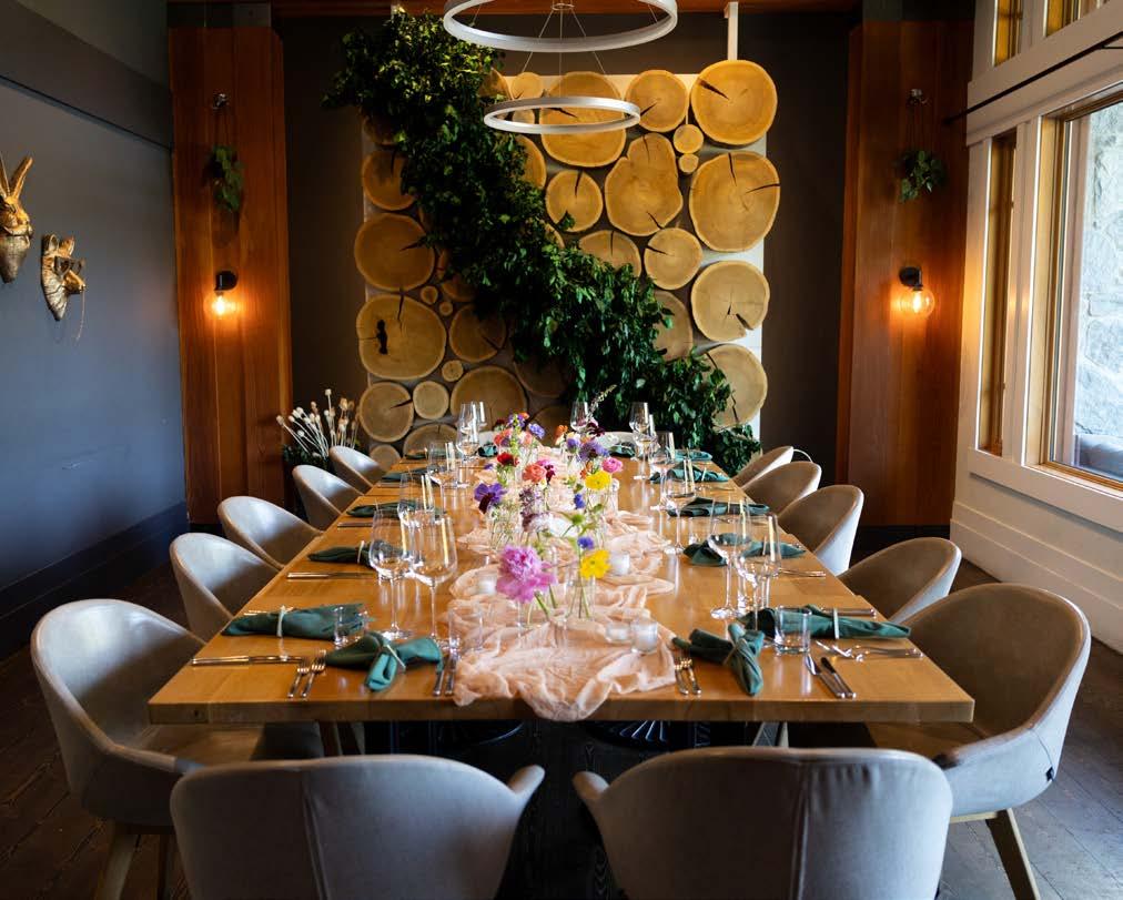 TheDen Lakeside Restaurant allows guests to experience our chefs in action with its open kitchen concept while savouring one of Whistler’s spectacular views. The space is inspired by nature. The décor features an abundance of greenery, plants, and textures. Our events manager will recommend popular room layouts accommodating up to 60 guests with existing restaurant linen-less tables and chairs. Live entertainment and dancing not permitted. Event end time is 11pm indoors.