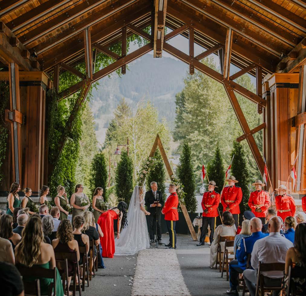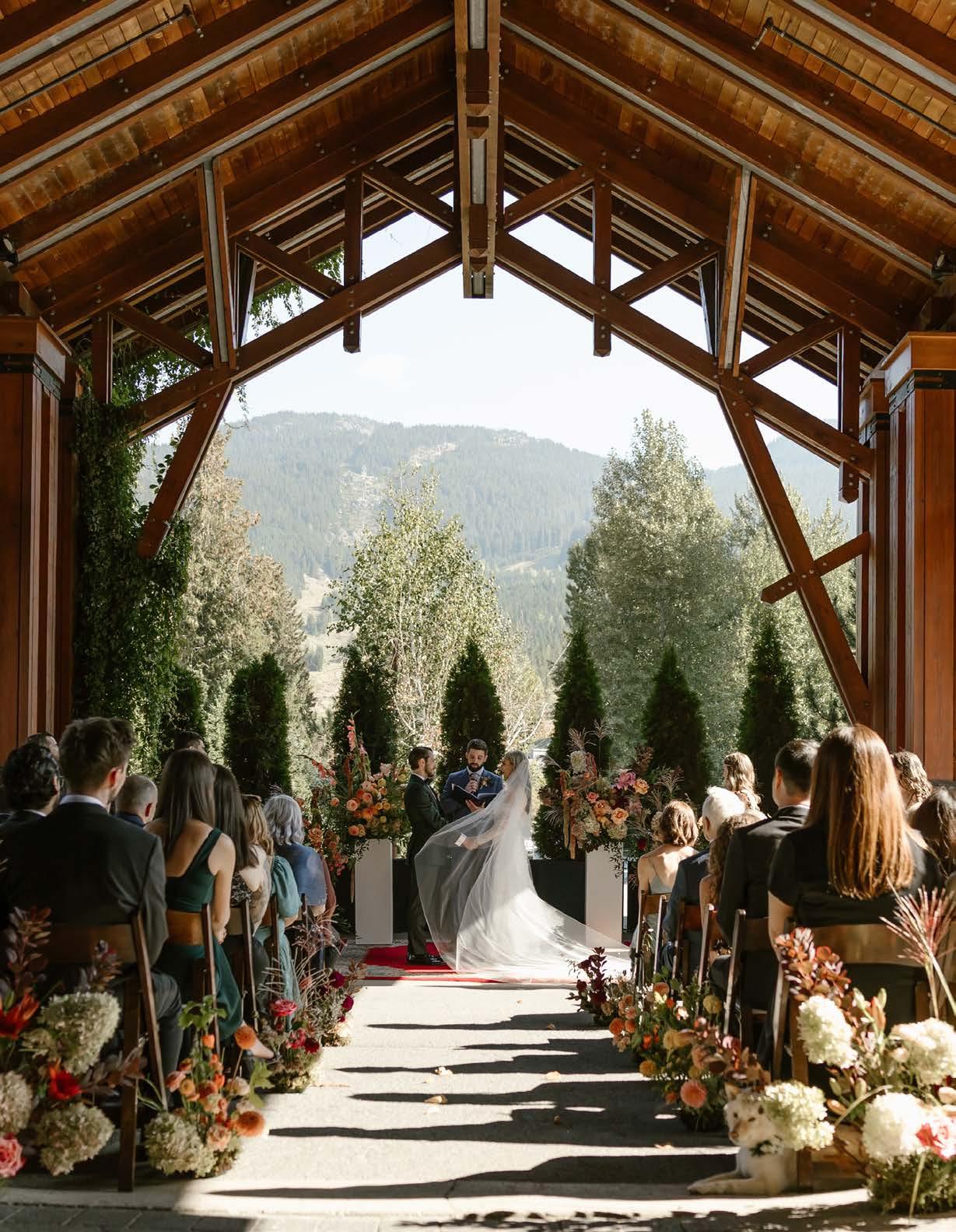 Surrounded by the natural beauty of Whistler, the Porte-cochère offers a stunning outdoor ceremony space framed by elegant Douglas-fir beams and accented with warm western red cedar. This picturesque venue overlooks Whistler Mountain Creekside, making it a favorite choice for weddings in every season.