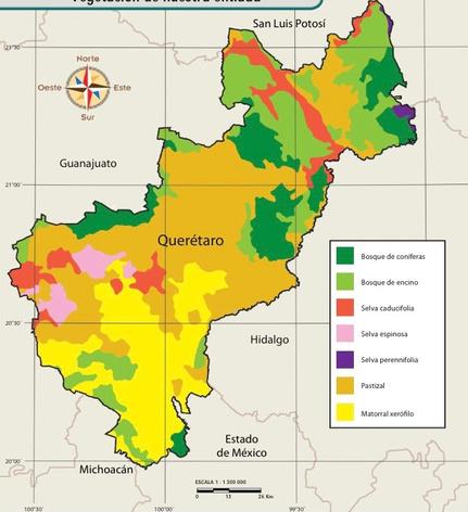 Querétaro tiene siete principales biomas los cuales son bosque de coníferas, bosque de encino, selva caducifolia, selva espinosa, selva perennifolia, pastizal y matorral xerófilo.