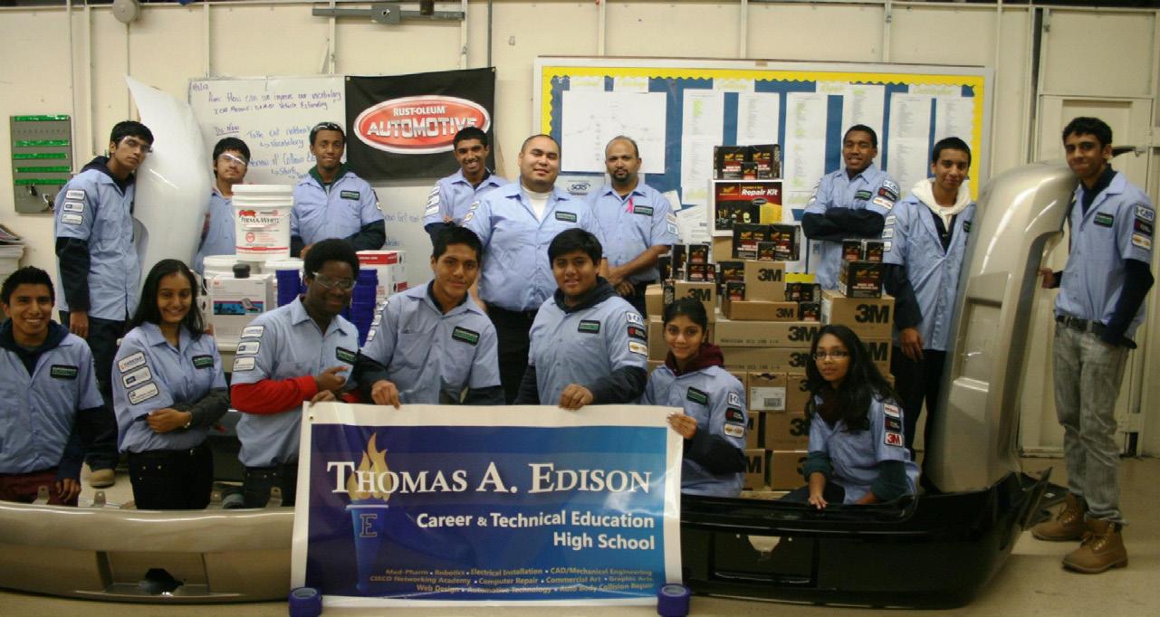 From top: Past Collision Repair Education Foundation grant winners include Thomas A Edison Career and Technical Education High School (Jamaica, NY), and Northwest High School (Clarksville, TN)