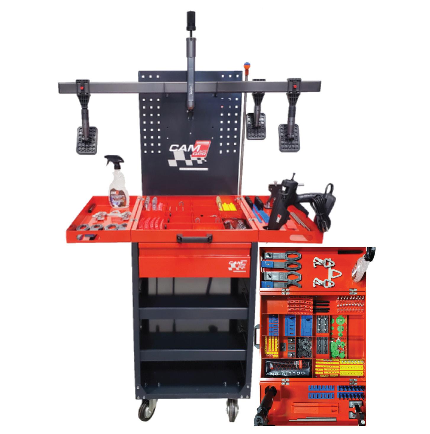 CAMAUTO PREMIUM ELITE CART is a heavy duty, mobile cart that helps you carry all your PDR and GPR tools. Equipped with a drawer, and with a steel tab organizer top for better tools and tabs organization, and with two foldable trays, that can be used as a side table, and that can be bent for a better storage space.