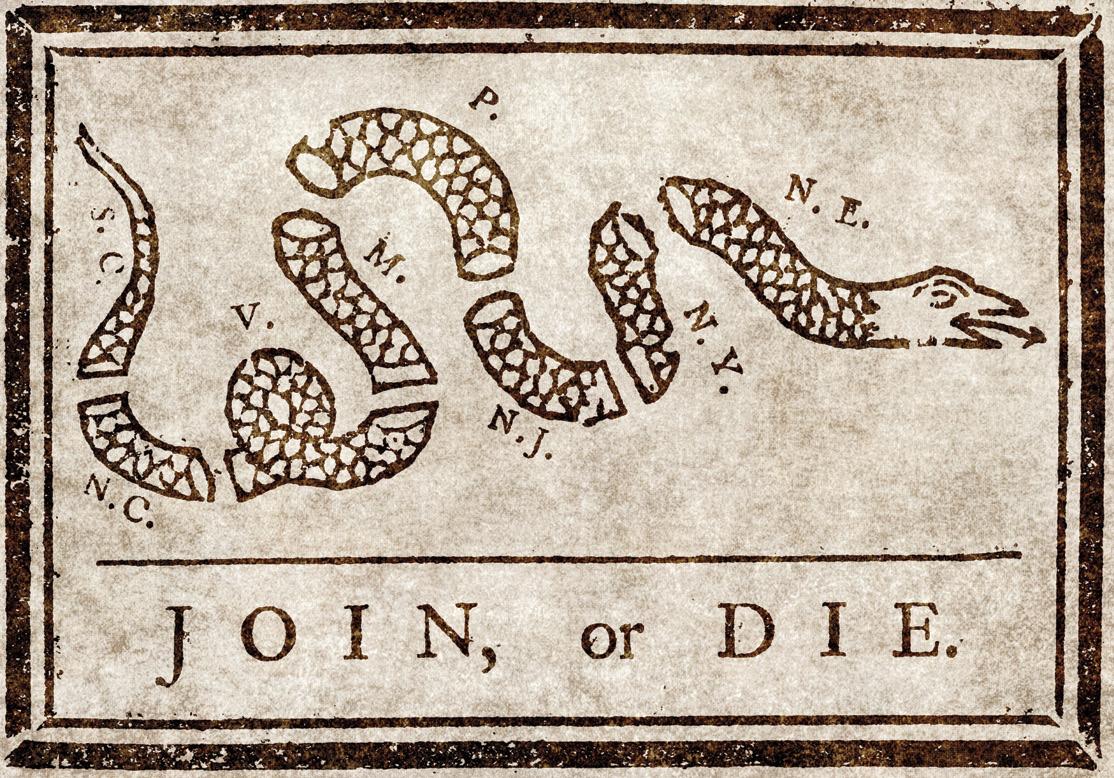 Back in 1754, Benjamin Franklin chose to depict the American colonies as a snake segmented by the initials of each colony. New England was shown as the head, with the body consisting of the other colonies, moving southward along the coast until South Carolina made up the tail.